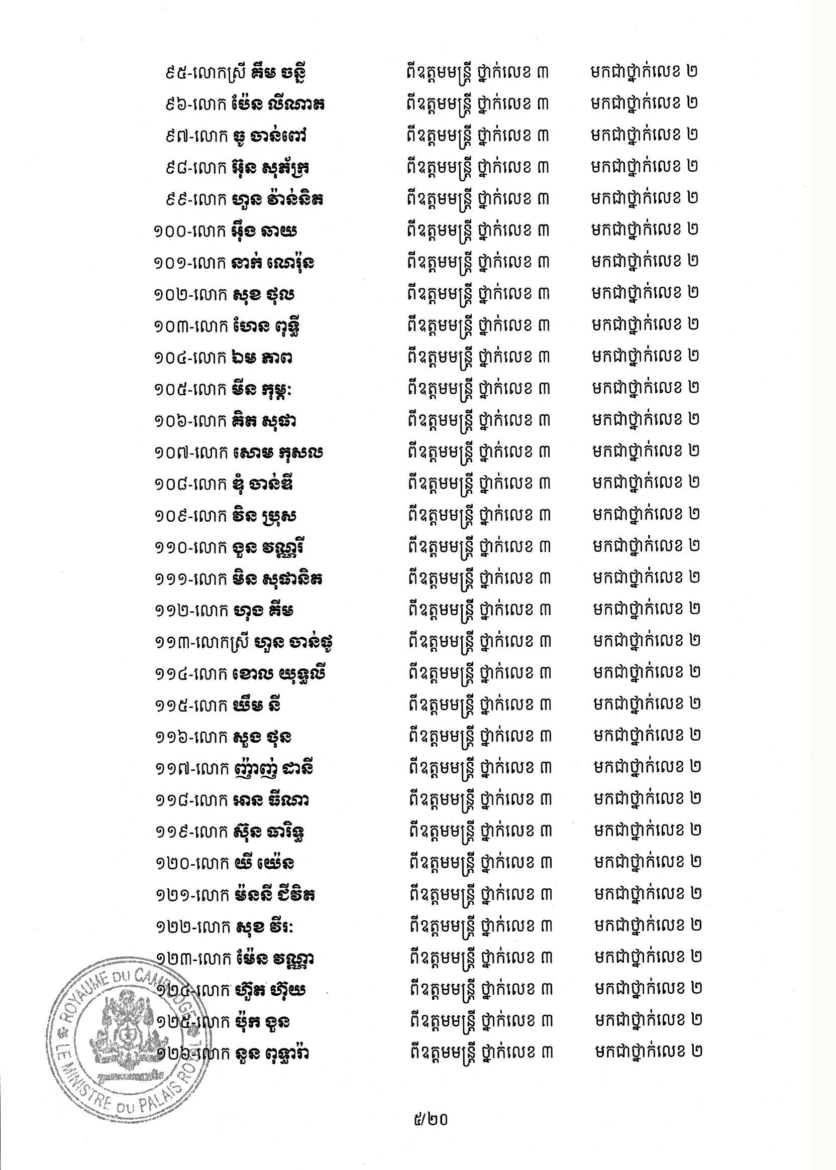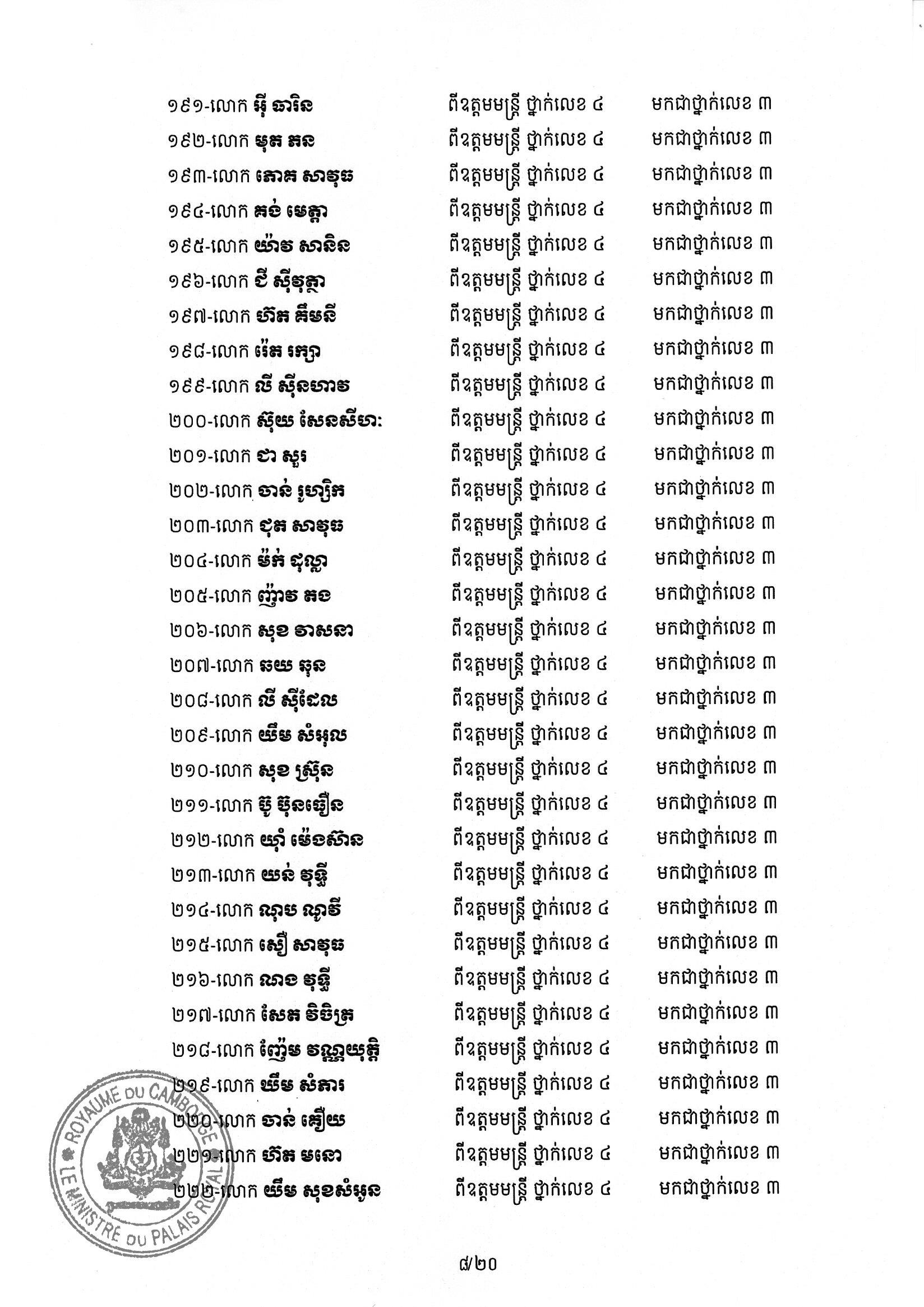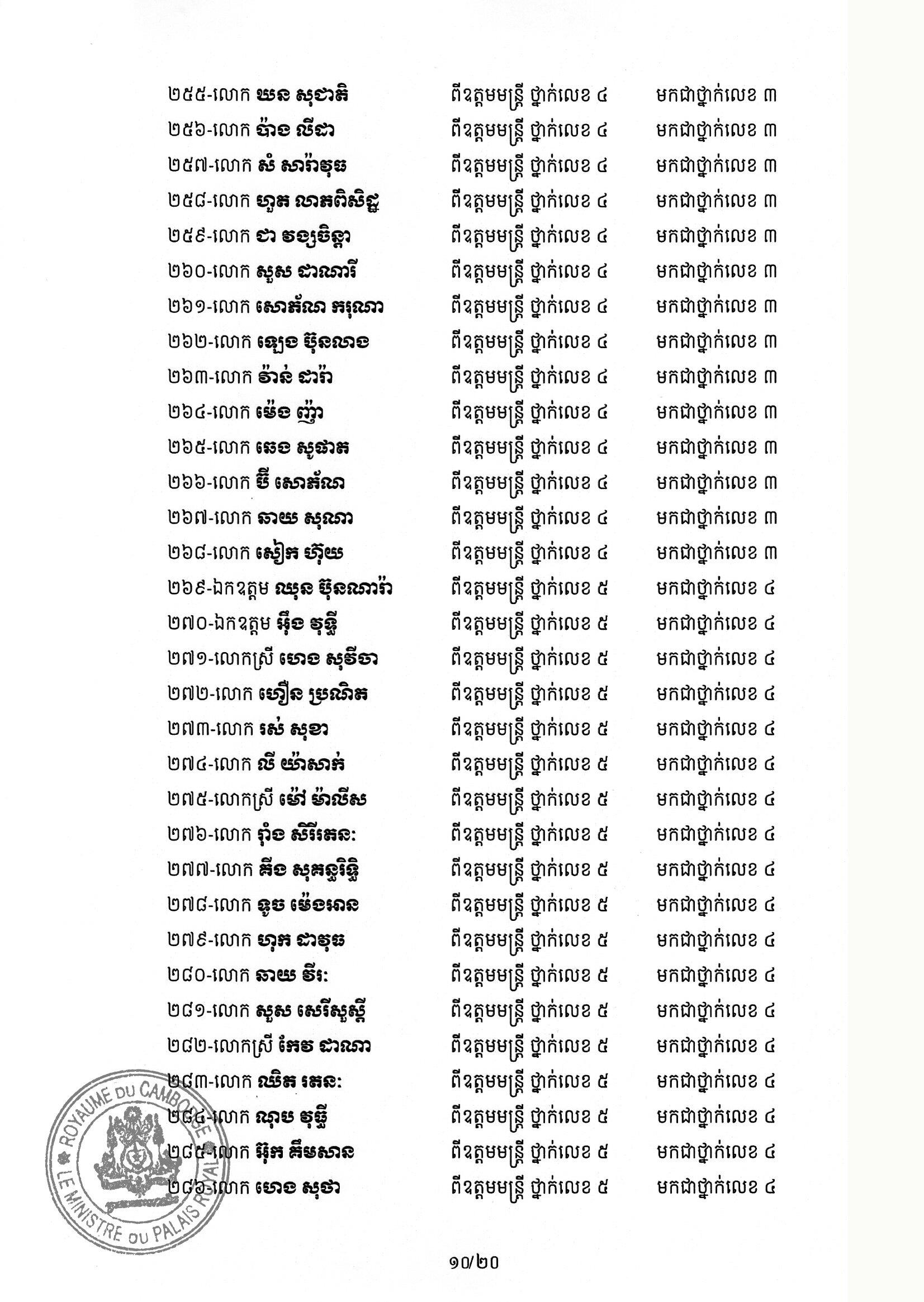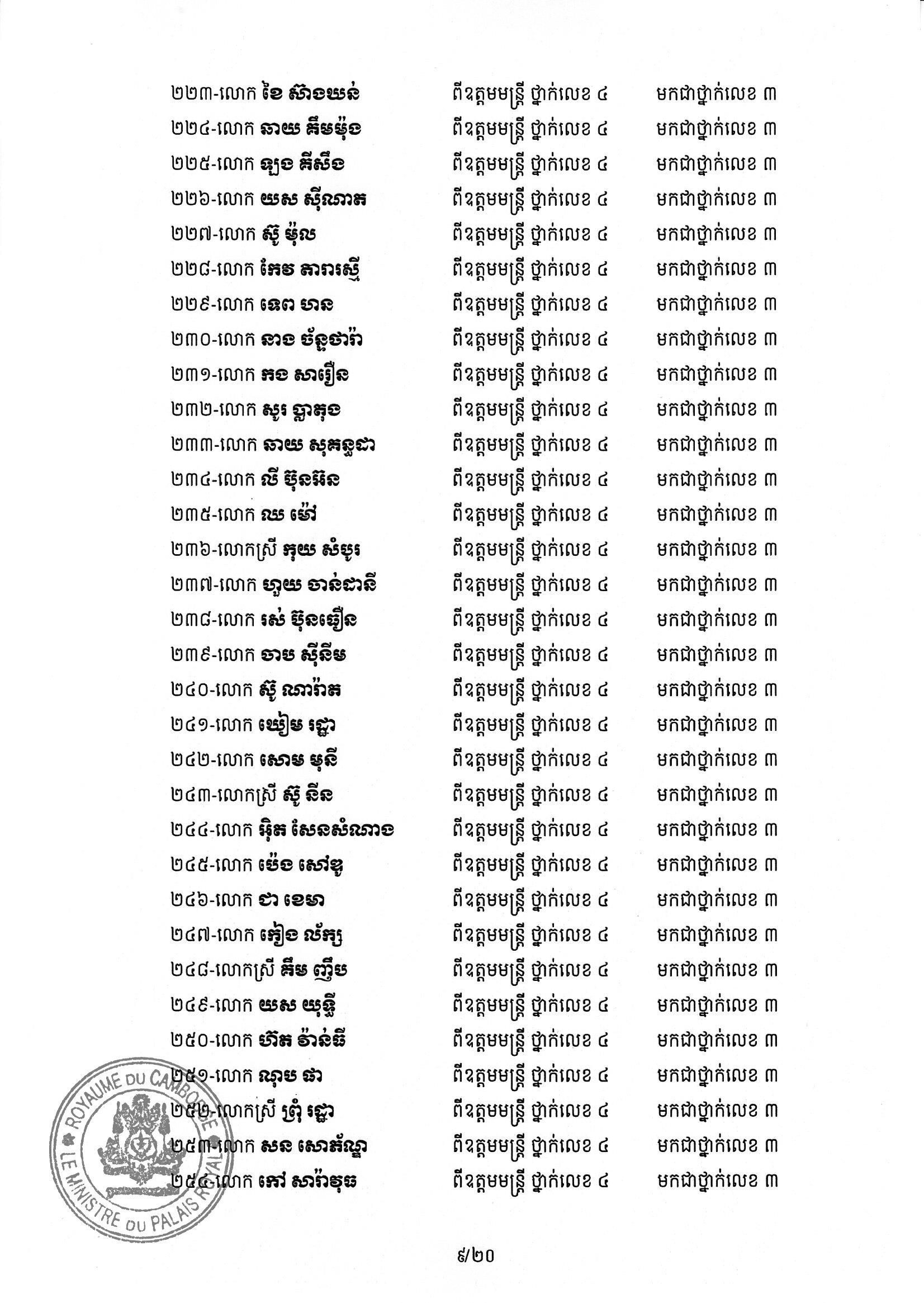សម្ដេចតេជោ ហ៊ុន សែន ប្រមុខរដ្ឋស្ដីទី ចេញព្រះរាជក្រឹត្យដំឡើងថ្នាក់ និងឋានន្តរស័ក្តិប្រចាំឆ្នាំ ក្នុងឋានន្តរស័ក្តិឧត្តមមន្ត្រី នៃក្រខ័ណ្ឌមន្ត្រីរដ្ឋបាលជាន់ខ្ពស់ក្រសួងមហាផ្ទៃ ៦០២រូប
