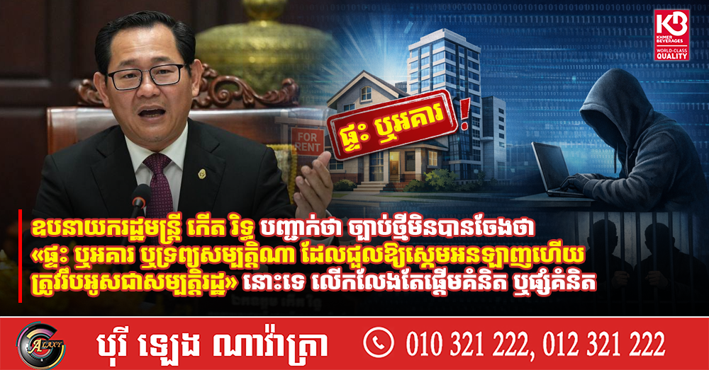 ឧបនាយករដ្ឋមន្រ្តី កើត រិទ្ធ បញ្ជាក់ថា ច្បាប់ថ្មីមិនបានចែងថា «ផ្ទះ ឬអគារ ឬទ្រព្យសម្បត្តិណា ដែលជួលឱ្យស្កេមអនឡាញហើយ ត្រូវរឹបអូសជាសម្បត្តិរដ្ឋ» នោះទេ លើកលែងតែផ្តើមគំនិត ឬផ្សំគំនិត(Video inside)