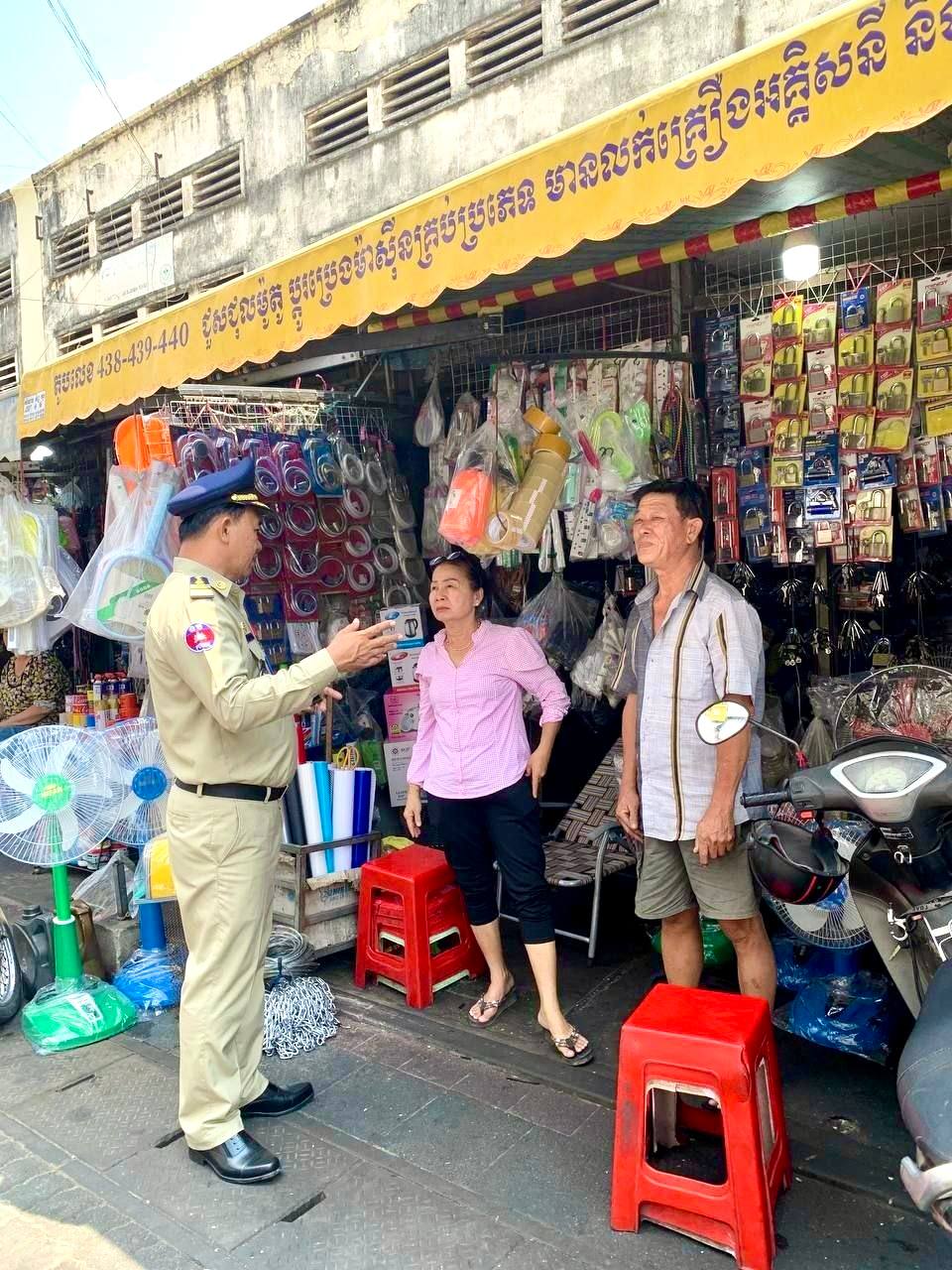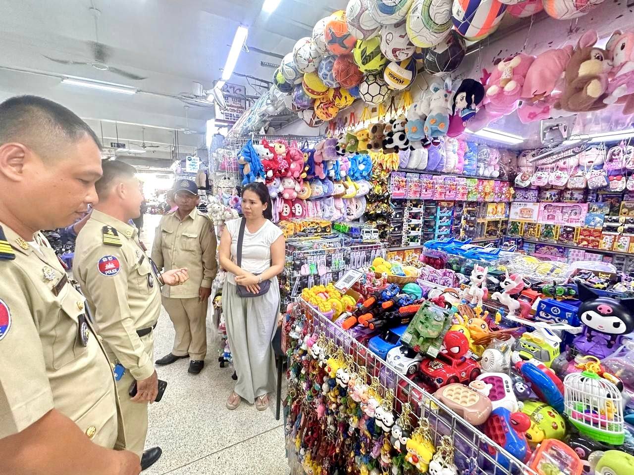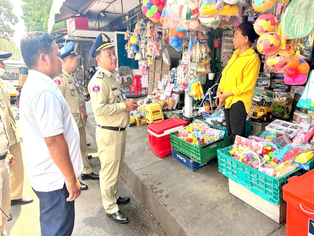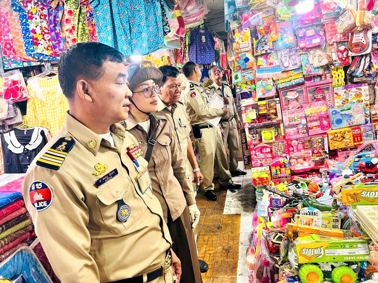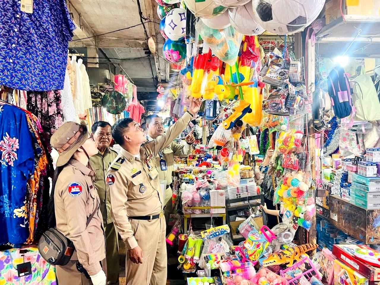 នគរបាលចុះទៅគ្រប់ទីផ្សារធំៗ ក្នុងភូមិសាស្ត្ររាជធានីភ្នំពេញ ដើម្បីណែនាំគ្រប់អាជីវករ មិនអនុញ្ញាតឱ្យនាំចូល តាំងលក់កាំភ្លើងបាញ់ទឹក ផាវ កាំជ្រួច ឬ គ្រឿងផ្ទុះផ្សេងៗ