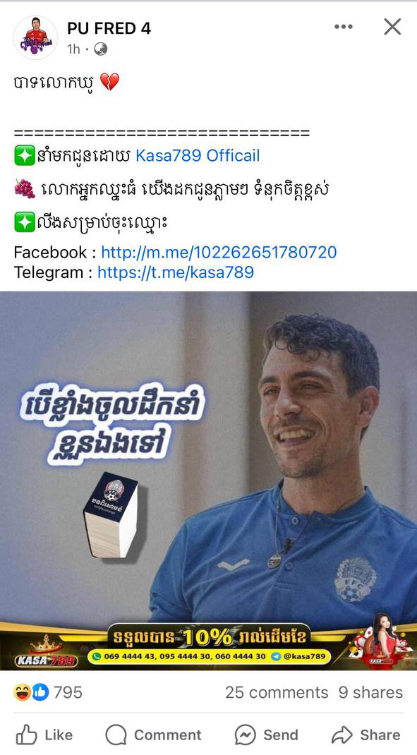*ការផ្សព្វផ្សាយ និងតំណភ្ជាប់ល្បែង៖ ក្រុមឧក្រិដ្ឋជនប្រើប្រាស់បណ្តាញសង្គម Telegram និង Facebook ដើម្បីផ្សព្វផ្សាយ និងផ្ញើតំណភ្ជាប់ (Link) សម្រាប់ចុះឈ្មោះលេងល្បែង។
