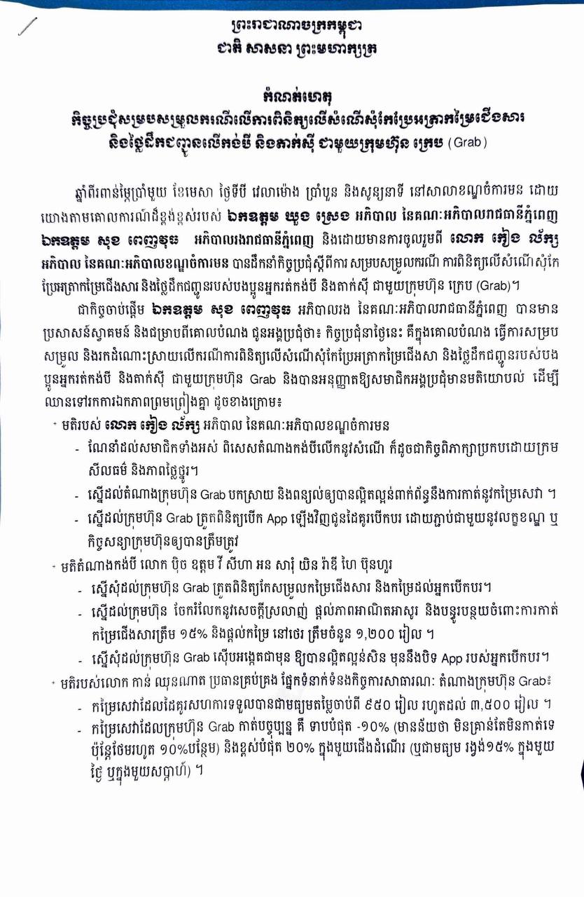ករណីអ្នករត់កង់បី និងតាក់ស៉ី ជាមួយក្រុមហ៊ុន Grab ត្រូវបានអាជ្ញាធររាជធានីភ្នំពេញសម្របសម្រួលដោះស្រាយបញ្ចប់, ក្រុមហ៊ុនទទួលយកសំណើរបស់អ្នកដឹកជញ្ជូន