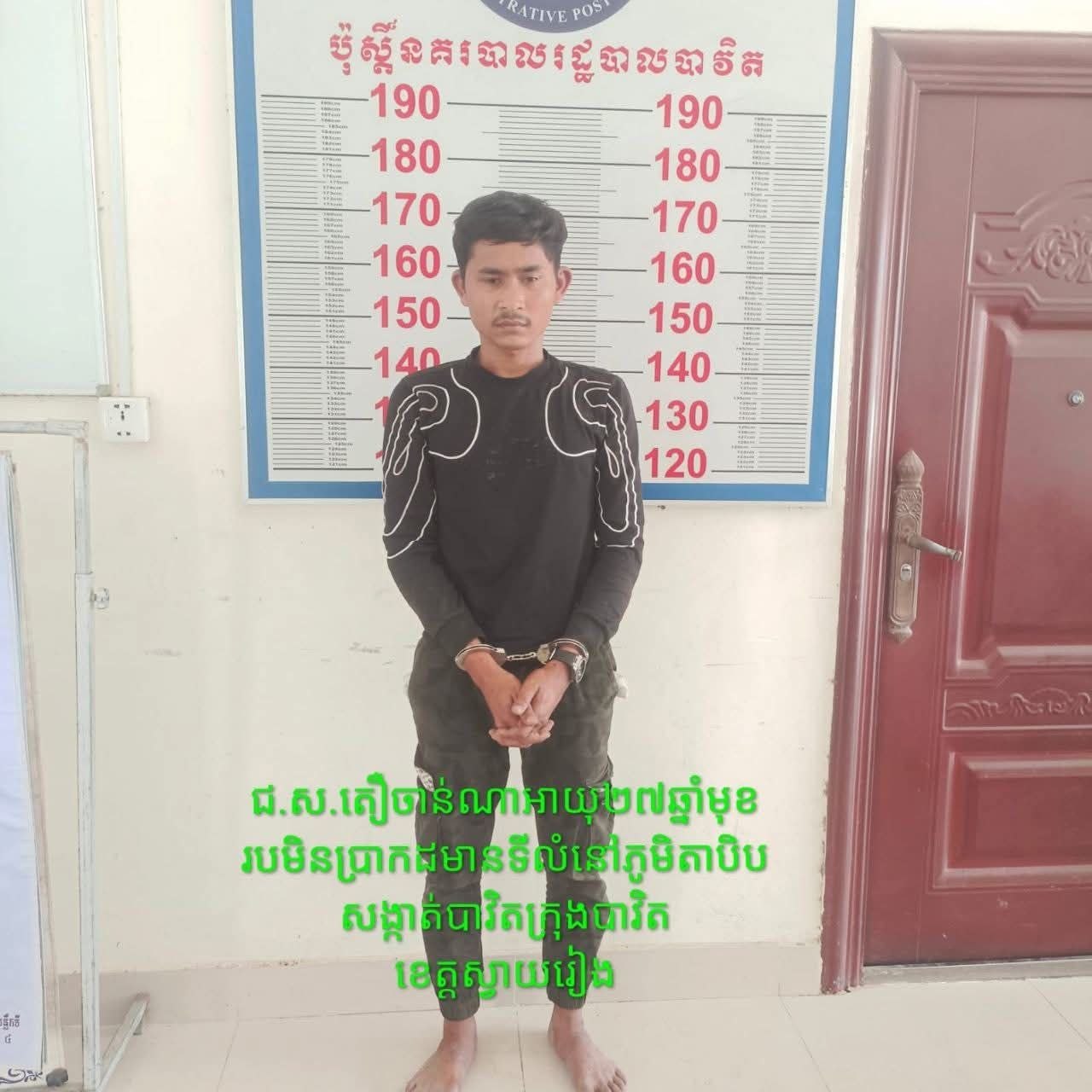 *ទី២៖ ឈ្មោះ តឿ ចាន់ណា ភេទប្រុស អាយុ២៧ឆ្នាំ មុខរបរមិនប្រាកដ មានទីលំនៅភូមិតាបិប សង្កាត់បាវិត ក្រុងបាវិត ខេត្តស្វាយរៀង។