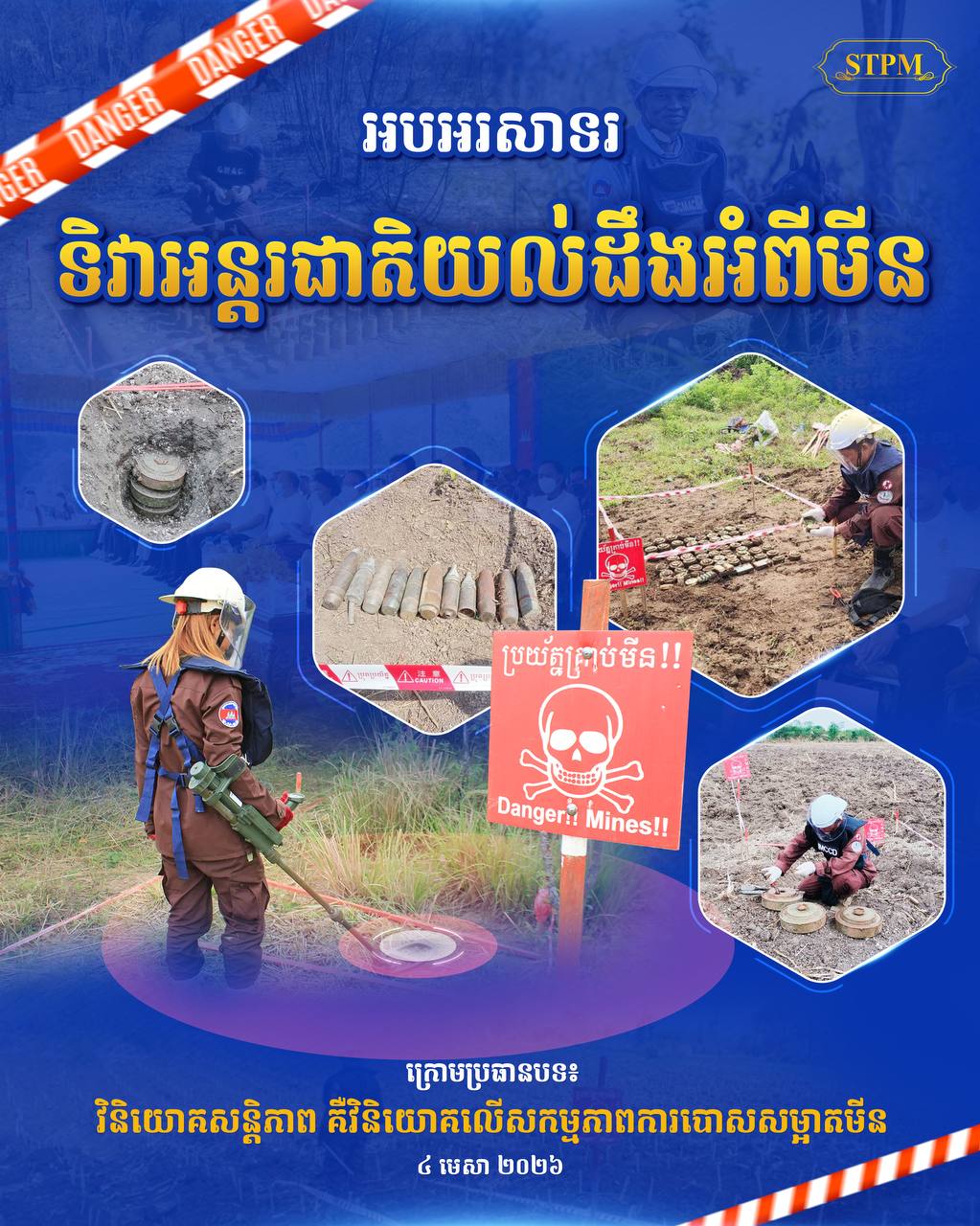 ទិវាអន្តរជាតិយល់ដឹងពីមីនឆ្នាំ២០២៦នេះ រៀបចំឡើងក្រោមប្រធានបទ «វិនិយោគសន្តិភាព គឺវិនិយោគលើសកម្មភាពការបោសសម្អាតមីន»។