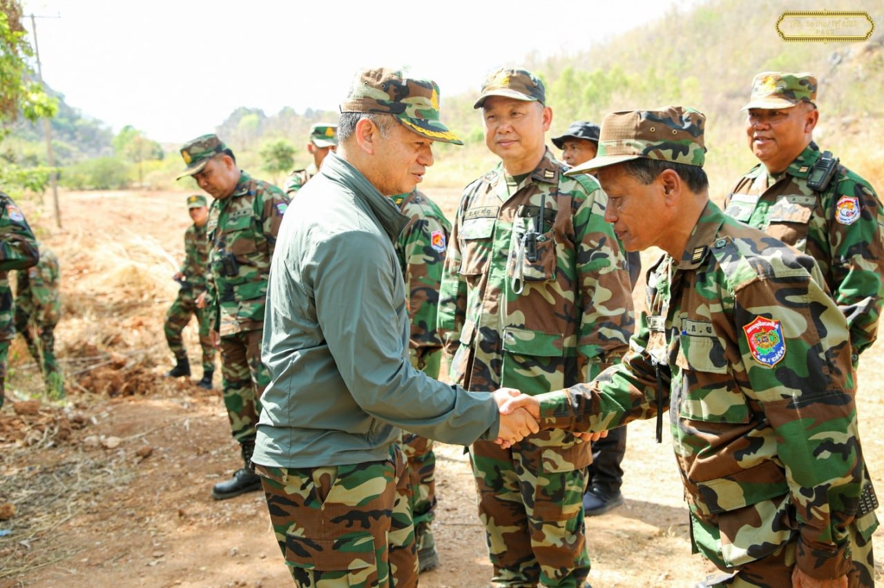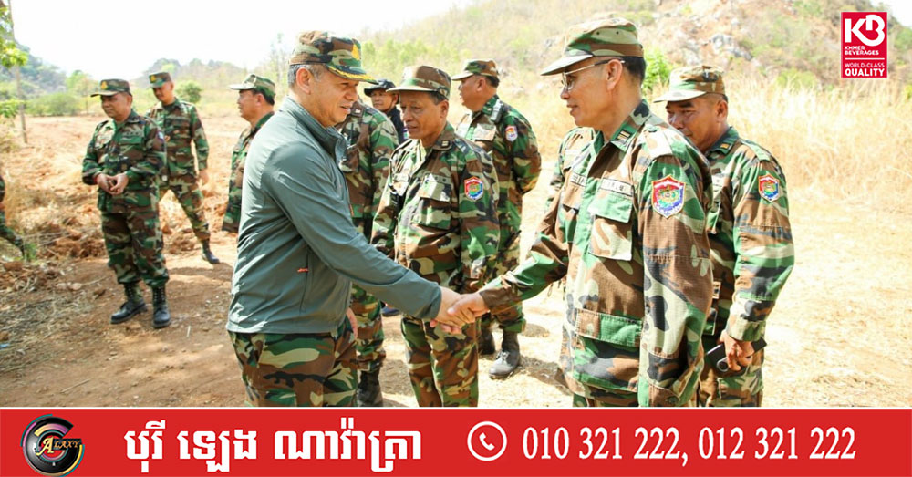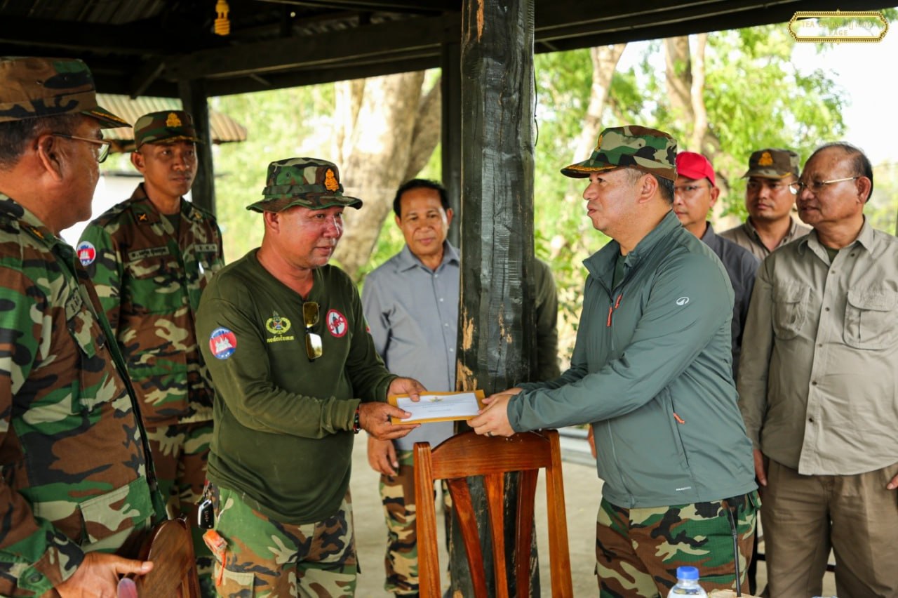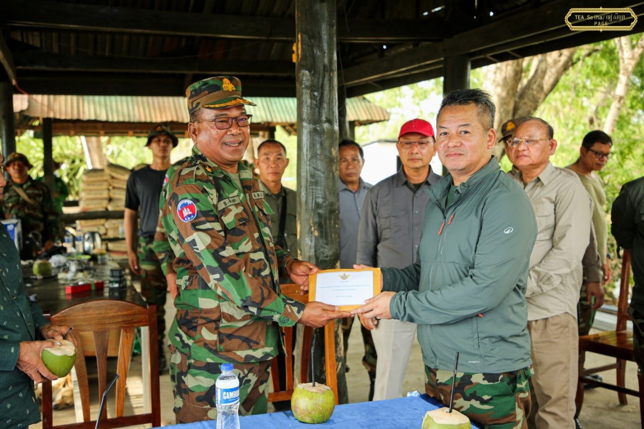 (ព្រំដែន)៖ នាយឧត្តមសេនីយ៍ ទៀ សីហា ឧបនាយករដ្ឋមន្ត្រី រដ្ឋមន្ត្រីក្រសួងការពារជាតិ នៅថ្ងៃទី៤ ខែមេសា ឆ្នាំ២០២៦នេះ បានចុះសួរសុខទុក្ខ និងជូនពរជ័យសិរីសួស្តីដល់យោធិនដែលកំពុងបំពេញបេសកកម្មដ៏ឧត្តុង្គឧត្តមក្នុងការការពារបូរណភាពទឹកដី នៅសមរភូមិមុខតាមបណ្តោយព្រំដែនកម្ពុជា-ថៃ នៅទិសយោធភូមិភាគទី៥ ក្នុងភូមិសាស្រ្តខេត្តបន្ទាយមានជ័យ ខេត្តបាត់ដំបង ក្នុងឱកាសនៃបុណ្យចូលឆ្នាំថ្មី ប្រពៃណីជាតិ ឆ្នាំមមី អដ្ឋស័ក ពុទ្ធសករាជ ២៥៧០ ដែលនឹងឈានមកដល់នៅពេលខាងមុខ។