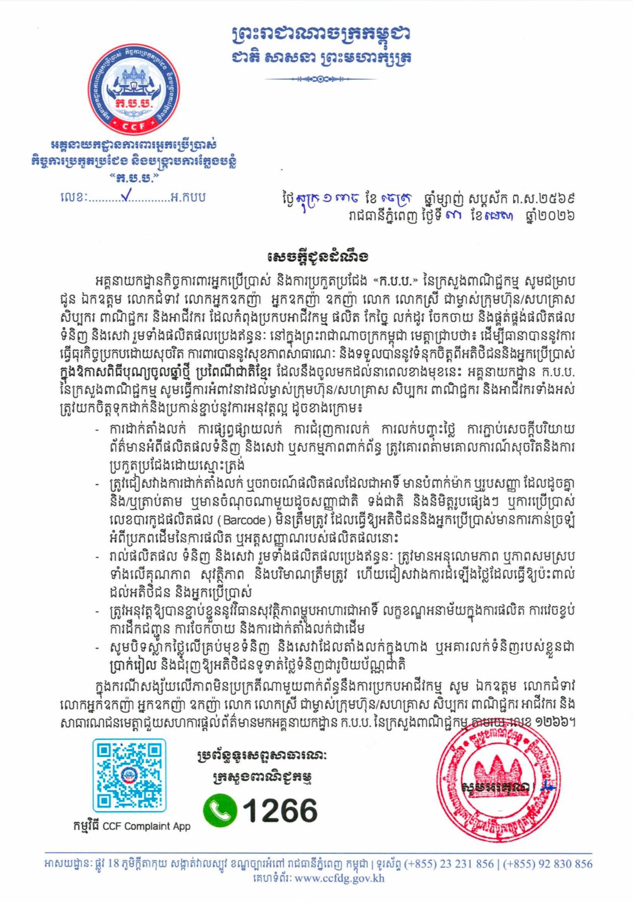 នៅក្នុងសេចក្តីជូនដំណឹងរបស់អគ្គនាយកដ្ឋានកិច្ចការពារអ្នកប្រើប្រាស់ និងការប្រកួតប្រជែង ដែលបណ្តាញព័ត៌មាន Fresh News ទទួលបាននៅថ្ងៃទី៤ ខែមេសា ឆ្នាំ២០២៦នេះ បានបញ្ជាក់ឱ្យដឹងទៀតថា អគ្គនាយកដ្ឋានសូមធ្វើការអំពាវនាវដល់ម្ចាស់ក្រុមហ៊ុន/សហគ្រាស សិប្បករ ពាណិជ្ជករ និងអាជីវករទាំងអស់ ត្រូវយកចិត្តទុកដាក់និងប្រកាន់ខ្ជាប់នូវការអនុវត្តល្អ ដូចខាងក្រោម៖
