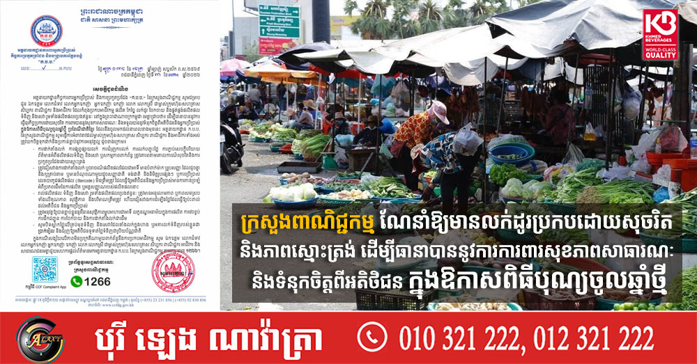 ក្រសួងពាណិជ្ជកម្ម ណែនាំឱ្យមានលក់ដូរប្រកបដោយសុចរិត និងភាពស្មោះត្រង់ ដើម្បីធានាបាននូវការការពារសុខភាពសាធារណៈ និងទំនុកចិត្តពីអតិថិជន ក្នុងឱកាសពិធីបុណ្យចូលឆ្នាំថ្មី (Video inside)