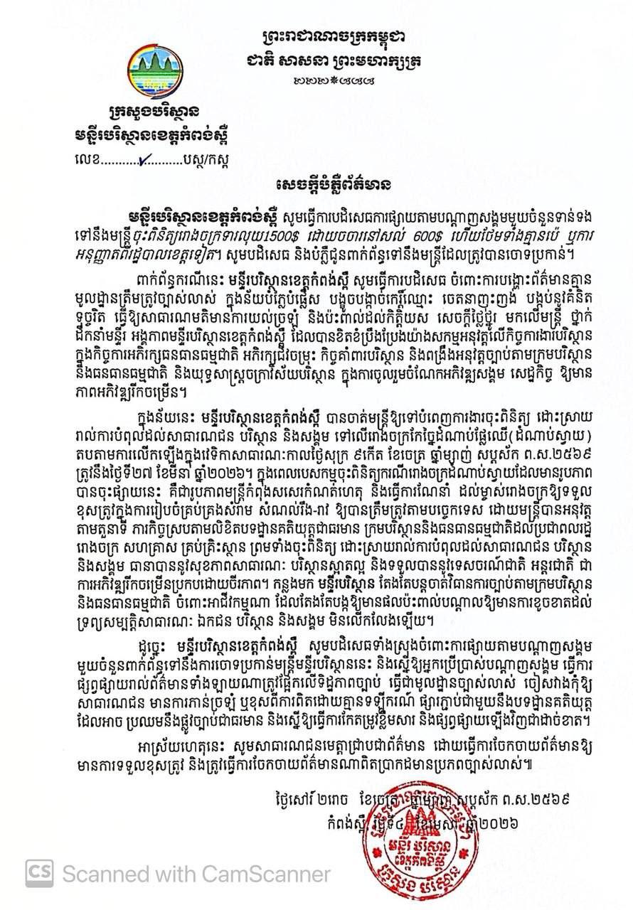 ខាងក្រោមនេះជាលិខិតបំភ្លឺរបស់មន្ទីរបរិស្ថានខេត្តកំពង់ស្ពឺ៖