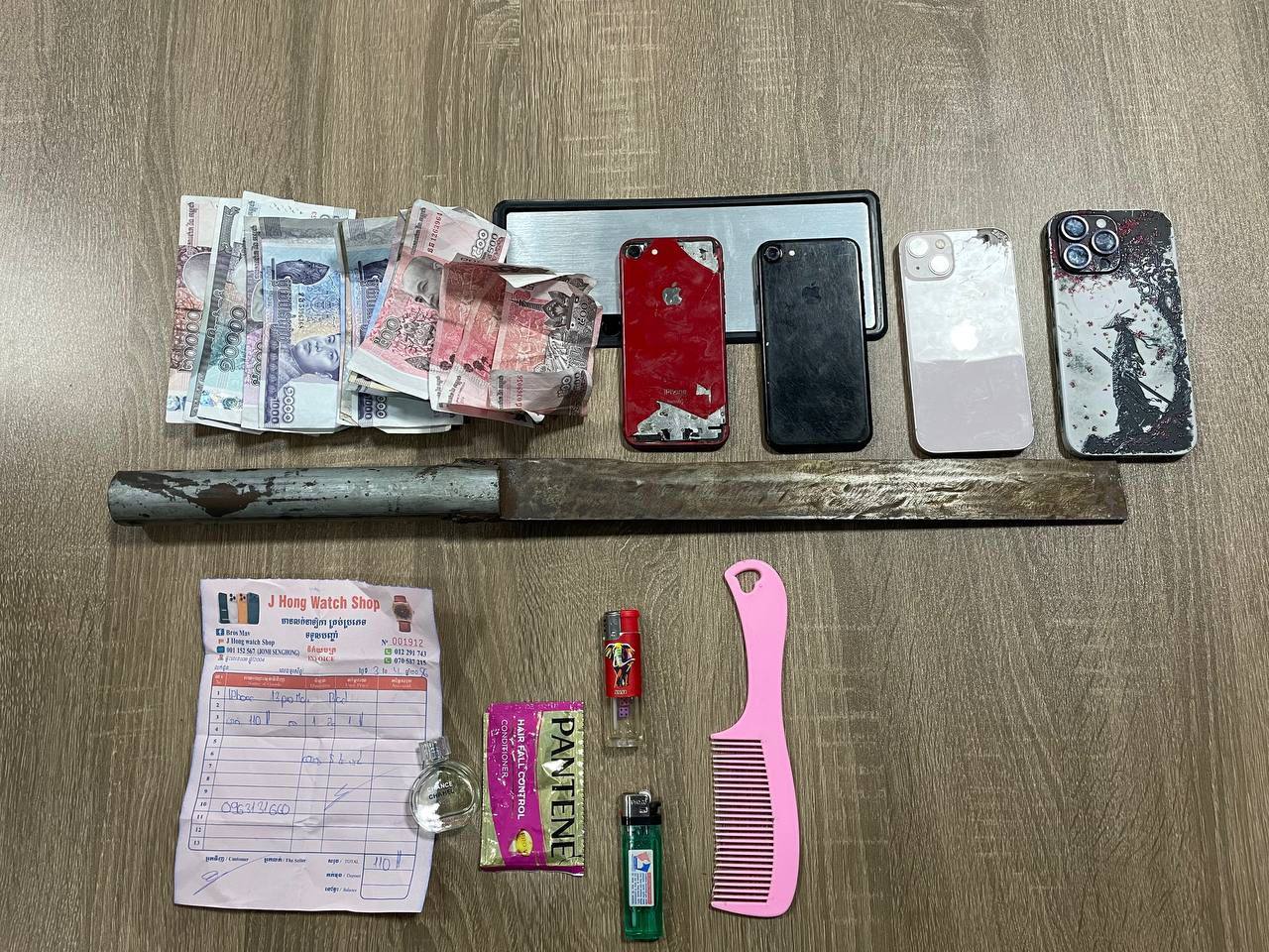 ភ្លាមៗនោះ កងកម្លាំងក៏បានធ្វេីការឃាត់ខ្លួនជនសង្ស័យចំនួន ២នាក់ និងម៉ូតូចំនួន ១គ្រឿង។ កងកម្លាំងក៏បន្តប្រដេញតាម ទៅដល់ក្រោយក្រសួងបរិស្ថាន សង្កាត់ទន្លេបាសាក់ ខណ្ឌចំការមន ក៏បានឃាត់ខ្លួនជនសង្ស័យចំនួន ៣នាក់ និងម៉ូតូ ១គ្រឿង ដាវកែច្នៃចំនួន ១ដេីម ម៉ូតូ Suzaki nex ០២៥ ពាក់ស្លាកលេខ 1MJ-8734 ភ្នំពេញ Honda Dream ០២៥ ពាក់ស្លាកលេខ 1K-3577 ព្រះសីហនុ ខណៈទូរសព្ទ ដកហូតពីជនសង្ស័យចំនួន ៤គ្រឿង។