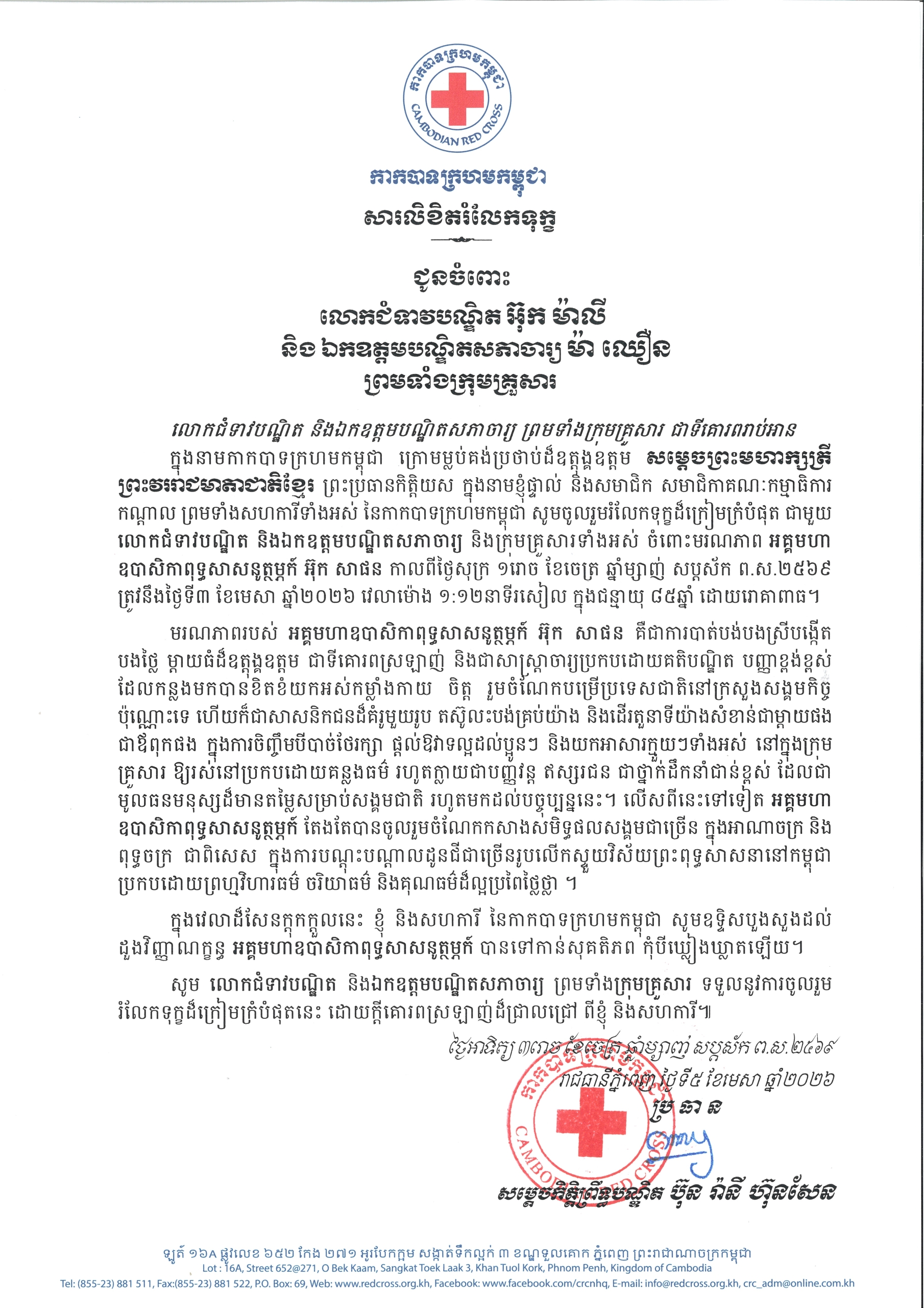 ក្នុងនាមកាកបាទក្រហមកម្ពុជា ក្រោមម្លប់គង់ប្រថាប់ដ៏ឧត្តុង្គឧត្តម សម្តេចព្រះមហាក្សត្រី ព្រះវររាជមាតាជាតិខ្មែរ ព្រះប្រធានកិត្តិយស ក្នុងនាមខ្ញុំផ្ទាល់ និងសមាជិក សមាជិកាគណៈកម្មាធិការកណ្តាល ព្រមទាំងសហការីទាំងអស់ នៃកាកបាទក្រហមកម្ពុជា សូមចូលរួមរំលែកទុក្ខដ៏ក្រៀមក្រំបំផុត ជាមួយ លោកជំទាវបណ្ឌិត និងឯកឧត្តមបណ្ឌិតសភាចារ្យ និងក្រុមគ្រួសារទាំងអស់ ចំពោះមរណភាព អគ្គមហាឧបាសិកាពុទ្ធសាសនូត្ថម្ភក៍ អ៊ុក សាផន កាលពីថ្ងៃសុក្រ ១រោច ខែចេត្រ ឆ្នាំម្សាញ់ សប្តស័ក ព.ស.២៥៦៩ ត្រូវនឹងថ្ងៃទី៣ ខែមេសា ឆ្នាំ២០២៦ វេលាម៉ោង ១៖១២នាទីរសៀល ក្នុងជន្មាយុ ៨៥ឆ្នាំ ដោយរោគាពាធ។