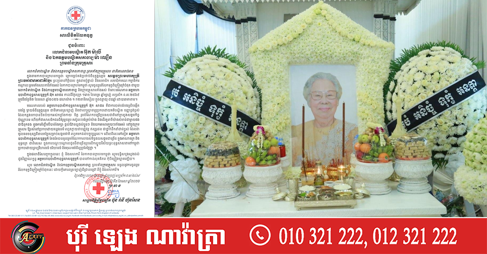 ក្នុងវេលាដ៏សែនក្ដុកក្ដួលនេះ ខ្ញុំ និងសហការី នៃកាកបាទក្រហមកម្ពុជា សូមឧទ្ទិសបួងសួងដល់ ដួងវិញ្ញាណក្ខន្ធ អគ្គមហាឧបាសិកាពុទ្ធសាសន្ទត្ថម្ភក៏ បានទៅកាន់សុគតិភព កុំបីឃ្លៀងឃ្លាតឡើយ។ សូមលោកជំទាវបណ្ឌិត និងឯកឧត្តមបណ្ឌិតសភាចារ្យ ព្រមទាំងក្រុមគ្រួសារ ទទួលនូវការចូលរួម រំលែកទុក្ខដ៏ក្រៀមក្រំបំផុតនេះ ដោយក្តីគោរពស្រឡាញ់ដ៏ជ្រាលជ្រៅ ពីខ្ញុំ និងសហការី៕