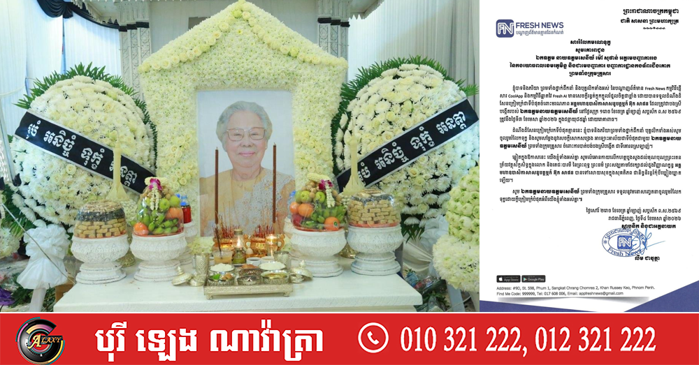 ដំណឹងដ៏សែនក្រៀមក្រំរកទីបំផុតគ្មាននេះ ខ្ញុំបាទនិងភរិយាព្រមទាំងថ្នាក់ដឹកនាំ បុគ្គលិកទាំងអស់សូមចូលរួមរំលែកទុក្ខ និងសូមសម្តែងនូវសេចក្តីសោកសង្រេង អាឡោះអាល័យជាទីបំផុតជាមួយ ឯកឧត្តមនាយឧត្តមសេនីយ៍ ព្រមទាំងក្រុមគ្រួសារ ចំពោះការបាត់បង់បងស្រីបង្កើត ជាទីគោរពស្រឡាញ់។