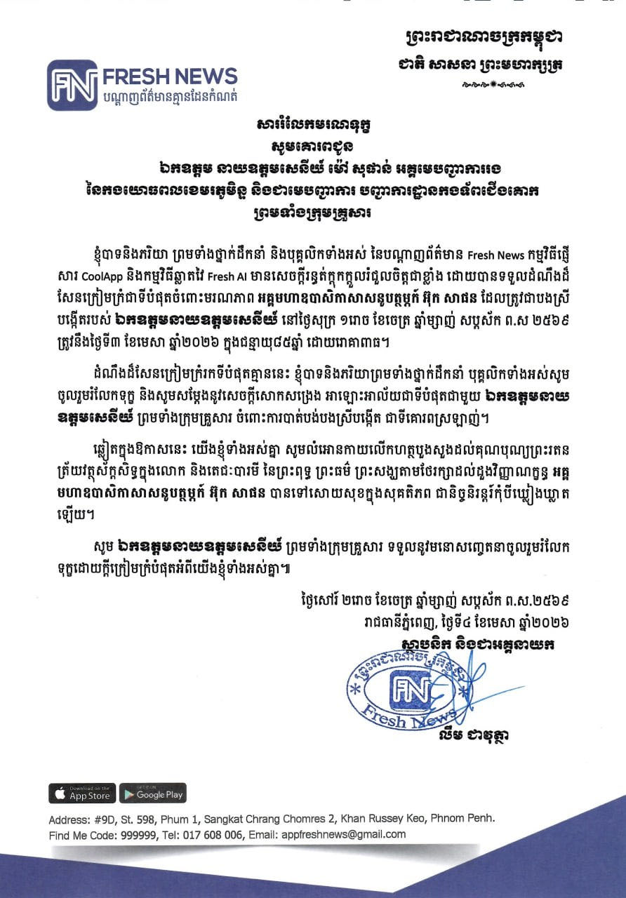 (ភ្នំពេញ)៖ ឯកឧត្តម លឹម ជាវុត្ថា ទីប្រឹក្សាផ្ទាល់សម្តេចនាយករដ្ឋមន្ដ្រី និងជាអគ្គនាយកបណ្តាញព័ត៌មាន Fresh News កម្មវិធីផ្ញើសារ CoolApp និងកម្មវិធីឆ្លាតវៃ Fresh AI បានផ្ញើសាររំលែកមរណទុក្ខ សូមគោរពជូនឯកឧត្តមនាយឧត្តមសេនីយ៍ ម៉ៅ សុផាន់ អគ្គមេបញ្ជាការរង នៃកងយោធពលខេមរភូមិន្ទ និងជាមេបញ្ជាការ បញ្ជាការដ្ឋានកងទ័ពជើងគោក ព្រមទាំងក្រុមគ្រួសារ ចំពោះមរណភាពអគ្គមហាឧបាសិកាសាសនូបត្ថម្ភក៍ អ៊ុក សាផន ដែលត្រូវជាបងស្រីបង្កើត។