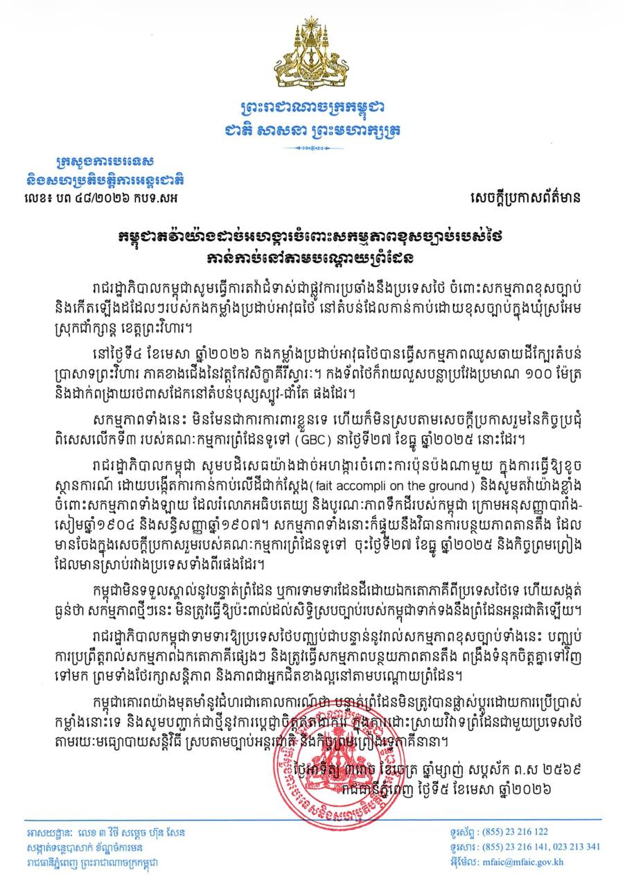 កម្ពុជាមិនទទួលស្គាល់នូវបន្ទាត់ព្រំដែន ឬការទាមទារដែនដីដោយឯកតោភាគីពីប្រទេសថៃទេ ហើយសង្កត់ ធ្ងន់ថា សកម្មភាពថ្មីៗនេះ មិនត្រូវធ្វើឱ្យប៉ះពាល់ដល់សិទ្ធិស្របច្បាប់របស់កម្ពុជាទាក់ទងនឹងព្រំដែនអន្តរជាតិឡើយ។