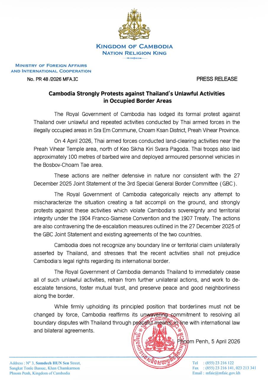 ប្រភពដដែលបន្តថា រាជរដ្ឋាភិបាលកម្ពុជា សូមបដិសេធយ៉ាងដាច់អហង្ការចំពោះការប៉ុនប៉ងណាមួយ ក្នុងការធ្វើឱ្យខូចស្ថានការណ៍ ដោយបង្កើតការកាន់កាប់លើដីជាក់ស្តែង (fait accompli on the ground) និងសូមតវ៉ាយ៉ាងខ្លាំង ចំពោះសកម្មភាពទាំងឡាយ ដែលរំលោភអធិបតេយ្យ និងបូរណៈភាពទឹកដីរបស់កម្ពុជា ក្រោមអនុសញ្ញាបារាំង-សៀមឆ្នាំ១៩០៤ និងសន្ធិសញ្ញាឆ្នាំ១៩០៧។ សកម្មភាពទាំងនោះក៏ផ្ទុយនឹងវិធានការបន្ថយភាពតានតឹង ដែល មានចែងក្នុងសេចក្តីប្រកាសរួមរបស់គណៈកម្មការព្រំដែនទូទៅ ចុះថ្ងៃទី២៧ ខែធ្នូ ឆ្នាំ២០២៥ និងកិច្ចព្រមព្រៀង ដែលមានស្រាប់រវាងប្រទេសទាំងពីរផងដែរ។
