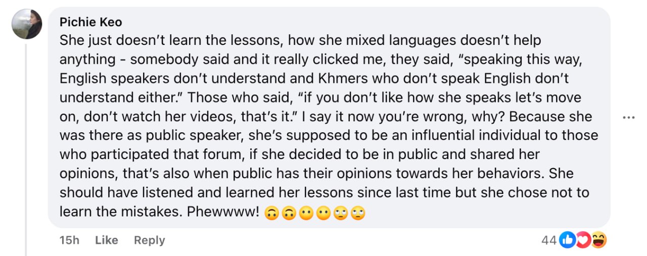 «ហួចកូនហ្នឹងស្តាយអី? និយាយអីចឹងឲ្យជនជាតិណាស្តាប់? គេថាឡូយ ឬពេលនិយាយបែបនឹង? ឬក៏អត់ចេះនិយាយខ្មែរពេញលេញ? ឬជោរពេក និយាយភាសារខ្មែរទៅវាមិនសមនឹងសម្ថភាពខ្លួន? និយាយមែន មួយជីវិតខ្ញុំស្គាល់អ្នកចេះអងគ្លេសច្រើនណាស់ កូនខ្មែរអាគាំងក៏ច្រើន តែអត់ដែលលឺនរណានិយាយបែបនេះបានឆ្ងល់»។ នេះបើតាមការបង្ហោះសាររបស់ហ្វេសប៊ុក Sweetie Berry។