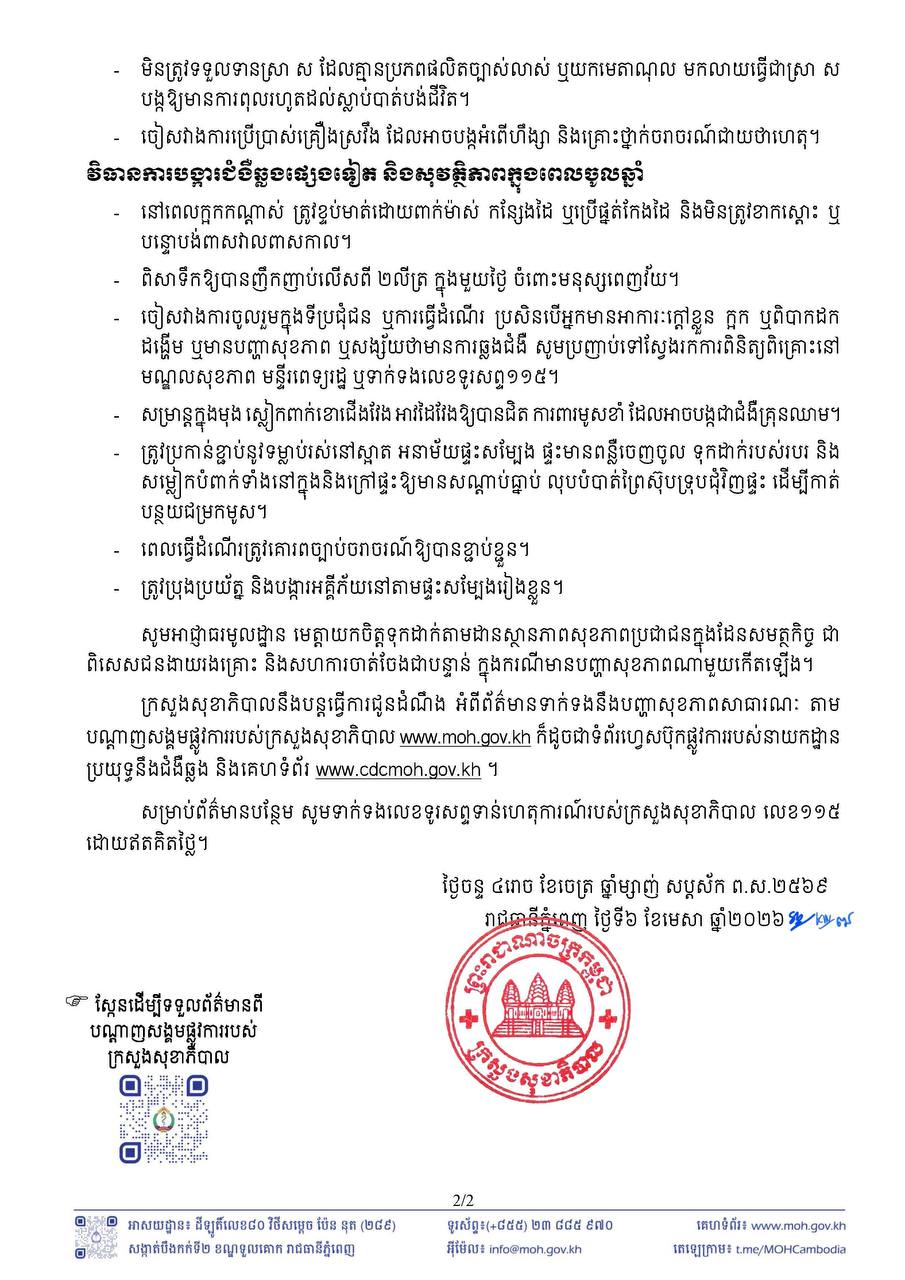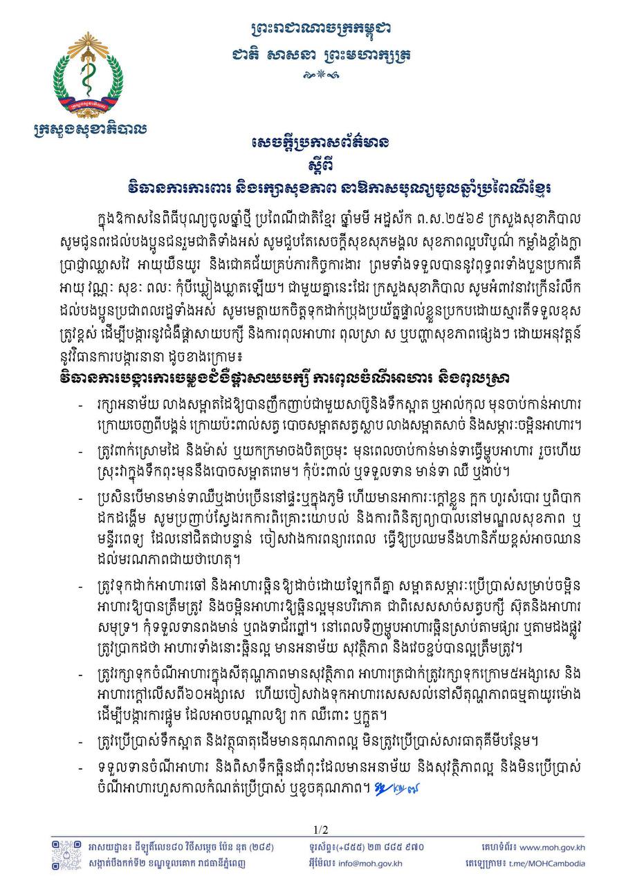(ភ្នំពេញ)៖ ក្រសួងសុខាភិបាល នៅថ្ងៃទី៦ ខែមេសា ឆ្នាំ២០២៦នេះ បានចេញសេចក្តីប្រកាសព័ត៌មាន ស្តីពីវិធានការការពារ និងរក្សាសុខភាព នាឱកាសបុណ្យចូលឆ្នាំប្រពៃណីខ្មែរ។