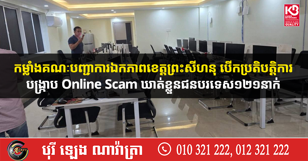(ព្រះសីហនុ)៖ កម្លាំងគណៈបញ្ជាការឯកភាពខេត្តព្រះសីហនុ ក្រោមការដឹកនាំបញ្ជាផ្ទាល់ពីលោក ម៉ាង ស៊ីណេត បានចុះពិនិត្យ និងឈានដល់ការបង្ក្រាបបទល្មើស Online Scam នៅទីតាំងស្នាក់នៅប្រមូលផ្តុំ មួយកន្លែង ក្នុងភូមិ៥ សង្កាត់លេខ៤ ក្រុងព្រះសីហនុ ដោយឃាត់ជនបរទេស១២១នាក់ មាន៩សញ្ជាតិ។