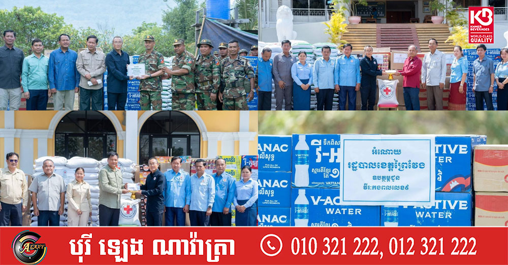 (ព្រៃវែង)៖ លោក សួន សុម៉ាលីន អភិបាលខេត្តព្រៃវែង រួមជាមួយអភិបាលរងខេត្ត មេបញ្ជាការកងកម្លាំងទាំង៣ និងមន្រ្តីពាក់ព័ន្ធ នៅថ្ងៃទី៤-៥ ខែមេសា ឆ្នាំ២០២៦ បាននាំយកស្បៀង សម្ភារប្រើប្រាស់ និងគ្រឿងឧបភោគបរិភោគ ជូនវីរៈកងទ័ព និងប្រជាពលរដ្ឋភៀសសឹក នៅទិសខេត្តព្រះវិហារ ខេត្តបន្ទាយមានជ័យ និងខេត្តឧត្តរមានជ័យ។
