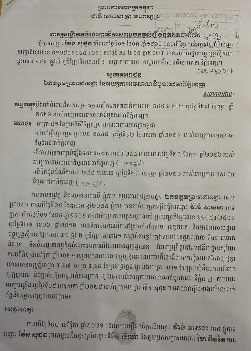 ក្រោយតំណាងអយ្យការអមសាលាដំបូងរាជធានីភ្នំពេញ តម្កល់រឿងមិនចាត់ការបែបនេះ កាលពីថ្ងៃទី២៤ ខែមីនា ឆ្នាំ២០២៦ លោក ម៉ែន សុផុន បានដាក់ពាក្យប្ដឹងតវ៉ាទៅកាន់សាលាឧទ្ធរណ៍ភ្នំពេញ។