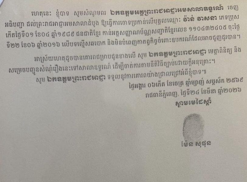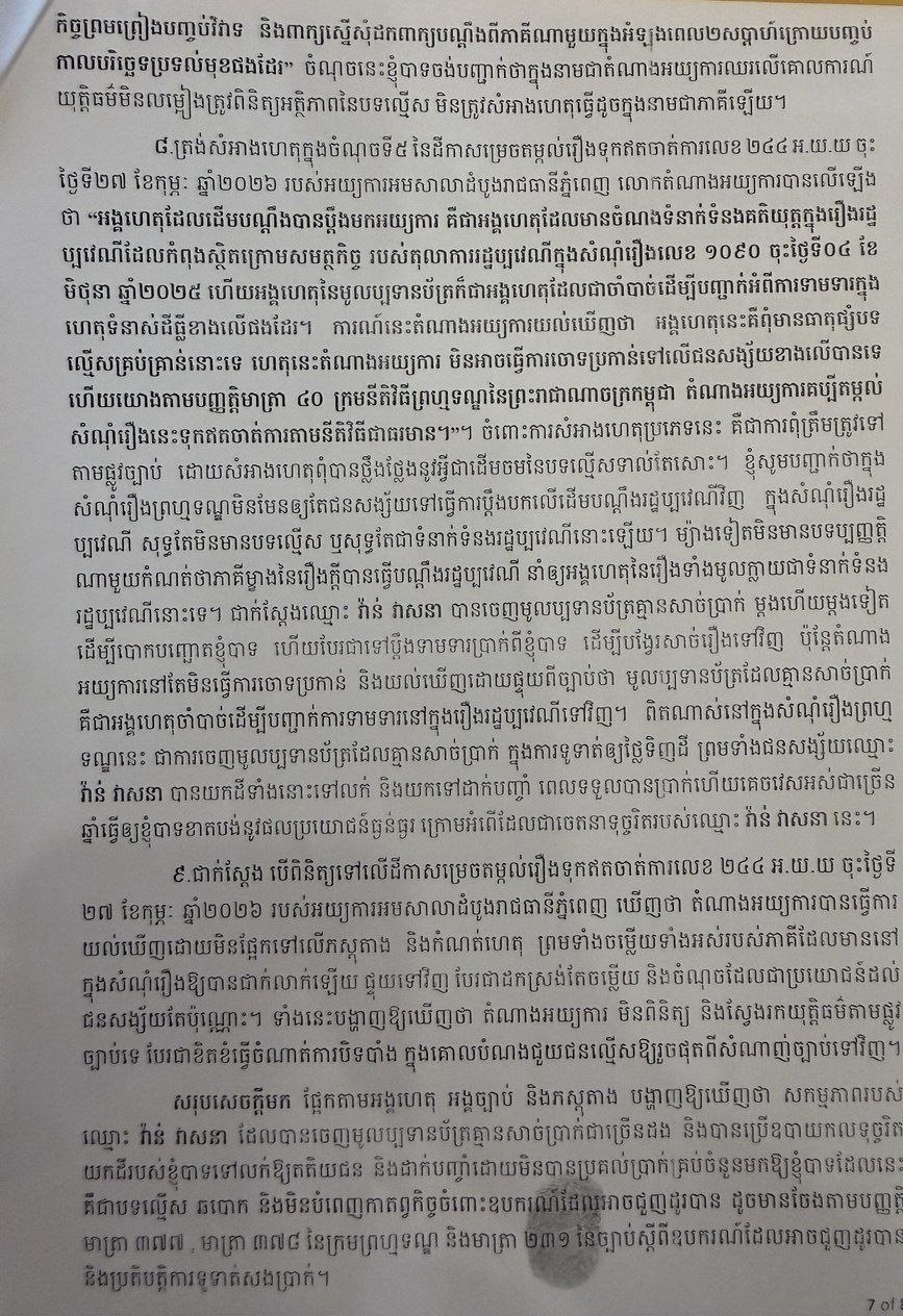 លោក ម៉ែន សុផុន សំណូមពឲ្យអគ្គព្រះរាជអាជ្ញា នៃមហាអយ្យការអមសាលាឧទ្ធរណ៍ភ្នំពេញ មេត្តាចេញអធិបញ្ជាឲ្យមានការចោទប្រកាន់លើជនល្មើសឈ្មោះ វ៉ាន់ វាសនា ពីបទ «ឆបោក និងមិនបំពេញកាតព្វកិច្ចចំពោះឧបករណ៍ ដែលអាចជួញដូរបាន» ទៅតាមអង្គហេតុ និងអង្គច្បាប់៕