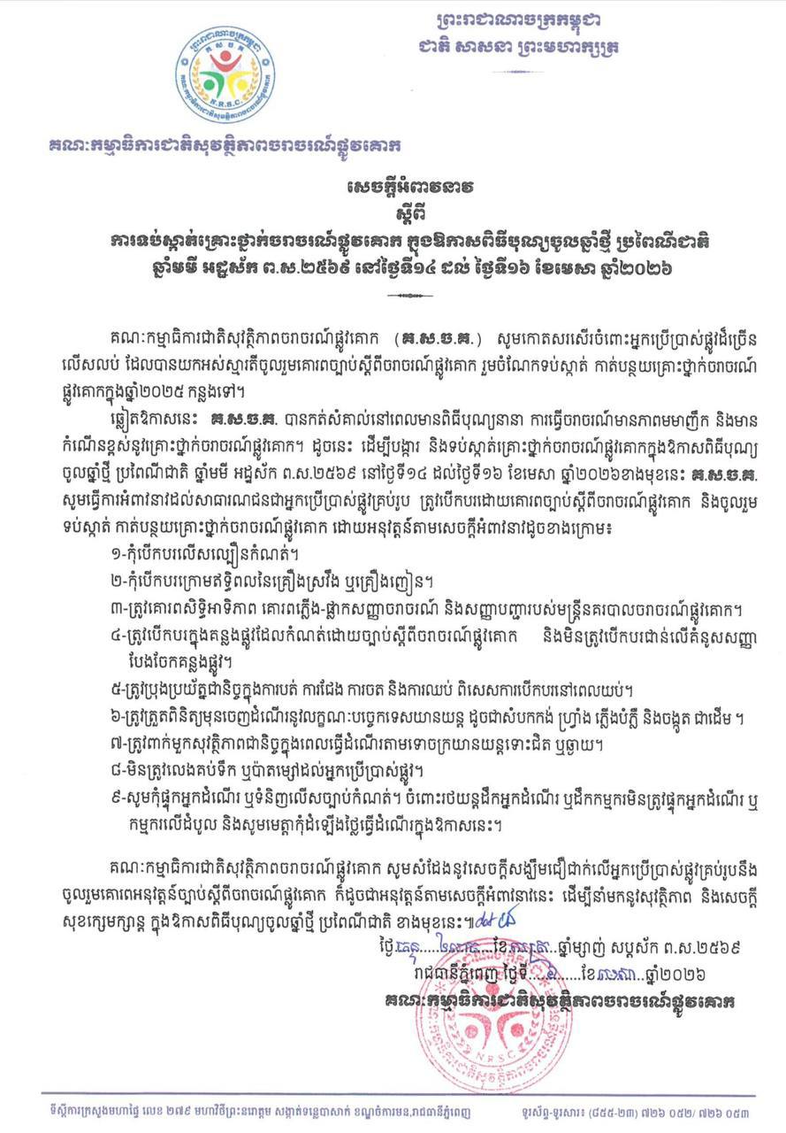 សេចក្តីអំពាវនាវដែលបណ្តាញព័ត៍មាន Fresh News ទទួលបាននៅថ្ងៃទី០៦ ខែមេសា ឆ្នាំ២០២៦នេះ គណៈកម្មាធិការជាតិសុវត្ថិភាពចរាចរណ៍ផ្លូវគោក បានធ្វើការអំពាវនាវដល់សាធារណជនជាអ្នកប្រើប្រាស់ផ្លូវគ្រប់រូប ត្រូវបើកបរដោយគោរពច្បាប់ស្តីពីចរាចរណ៍ផ្លូវគោក និងចូលរួម ទប់ស្កាត់ កាត់បន្ថយគ្រោះថ្នាក់ចរាចរណ៍ផ្លូវគោក ដោយអនុវត្តន៍តាមសេចក្តីអំពាវនាវដូចខាងក្រោម៖