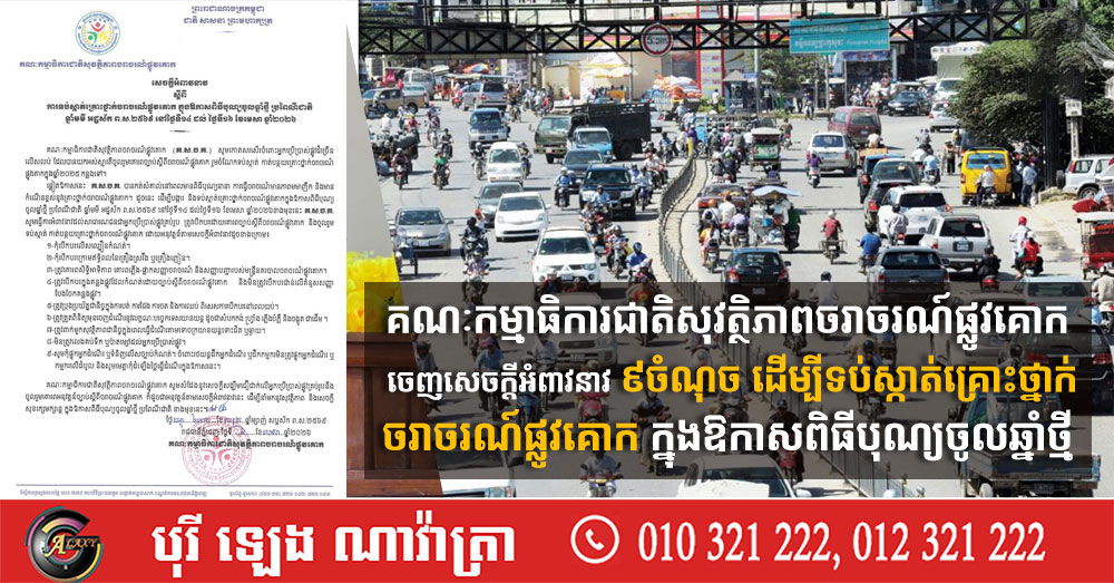 គណៈកម្មាធិការជាតិសុវត្ថិភាពចរាចរណ៍ផ្លូវគោក ចេញសេចក្តីអំពាវនាវ ៩ចំណុច ដើម្បីទប់ស្កាត់គ្រោះថ្នាក់ចរាចរណ៍ផ្លូវគោក ក្នុងឱកាសពិធីបុណ្យចូលឆ្នាំថ្មី