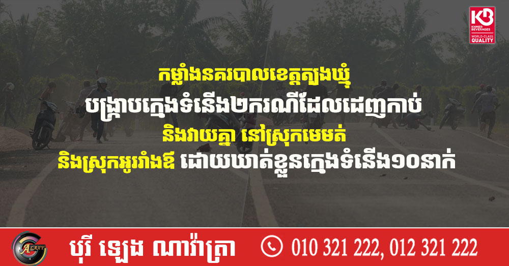 កម្លាំងនគរបាលខេត្តត្បូងឃ្មុំ បង្រ្កាបក្មេងទំនើង២ករណីដែលដេញកាប់ និងវាយគ្នា នៅស្រុកមេមត់ និងស្រុកអូររាំងឪ ដោយឃាត់ខ្លួនក្មេងទំនើង១០នាក់
