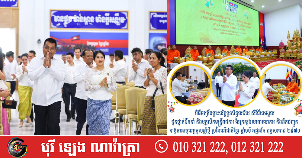 (ភ្នំពេញ)៖ នារសៀលថ្ងៃចន្ទ ទី៦ ខែមេសា ឆ្នាំ២០២៦នេះលោក ប៉េង ពោធិ៍នា រដ្ឋមន្ត្រីក្រសួងសាធារណការ និងដឹកជញ្ជូន និងលោកស្រី បានអញ្ជើញជាអធិបតីក្នុងពិធីចម្រើនព្រះបរិត្តប្រសិទ្ធពរជ័យ សិរីជ័យមង្គល ជូនថ្នាក់ដឹកនាំ និងបុគ្គលិកមន្ត្រីរាជការ នៃក្រសួងសាធារណការ និងដឹកជញ្ជូន នៅក្នុងឱកាសនៃពិធីបុណ្យចូលឆ្នាំថ្មី ប្រពៃណីជាតិខ្មែរ ឆ្នាំមមី អដ្ឋស័ក ពុទ្ធសករាជ ២៥៧០ ដោយមានការអញ្ជើញចូលរួមពីសំណាក់លោក លោកស្រី ជាថ្នាក់ដឹកនាំ ព្រមទាំងបុគ្គលិក មន្ត្រីរាជការក្រោមឱវាទក្រសួងគ្រប់លំដាប់ថ្នាក់ជាច្រើនរូបផងដែរ។