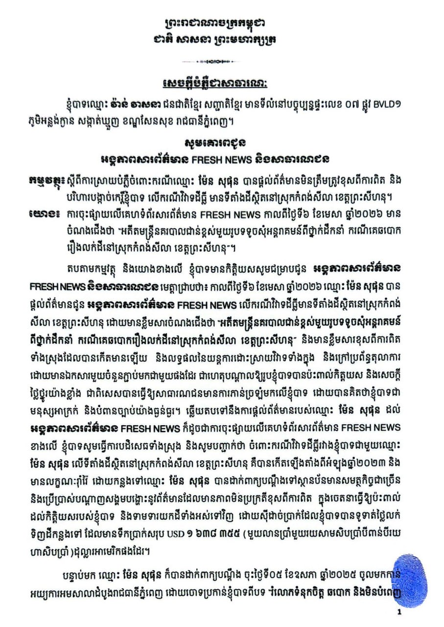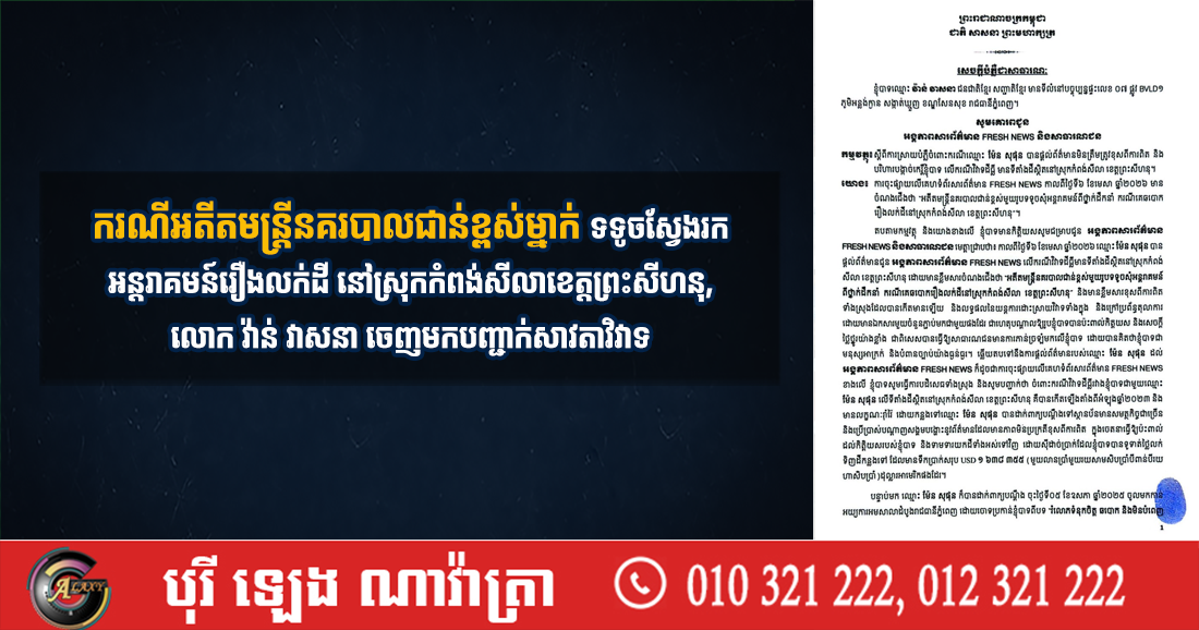 (ព្រះសីហនុ)៖ ករណីអតីតមន្រ្តីនគរបាលជាន់ខ្ពស់ម្នាក់ គឺលោក ម៉ែន សុផុន បានទទូចស្វែងរកកិច្ចអន្តរាគមន៍ បញ្ហារឿងលក់ដីនៅស្រុកកំពង់សីលា ខេត្តព្រះសីហនុ កាលពីឆ្នាំ២០១៩ ប៉ុន្ដែមិនទាន់បានលុយគ្រប់នោះ នៅពេលនេះ អ្នកទិញដី គឺលោក វ៉ាន់ វាសនា បានចេញមកបញ្ជាក់ពីសាវតានៃដំណើររឿង ដែលមានវិវាទជាមួយលោក ម៉ែន សុផុន។