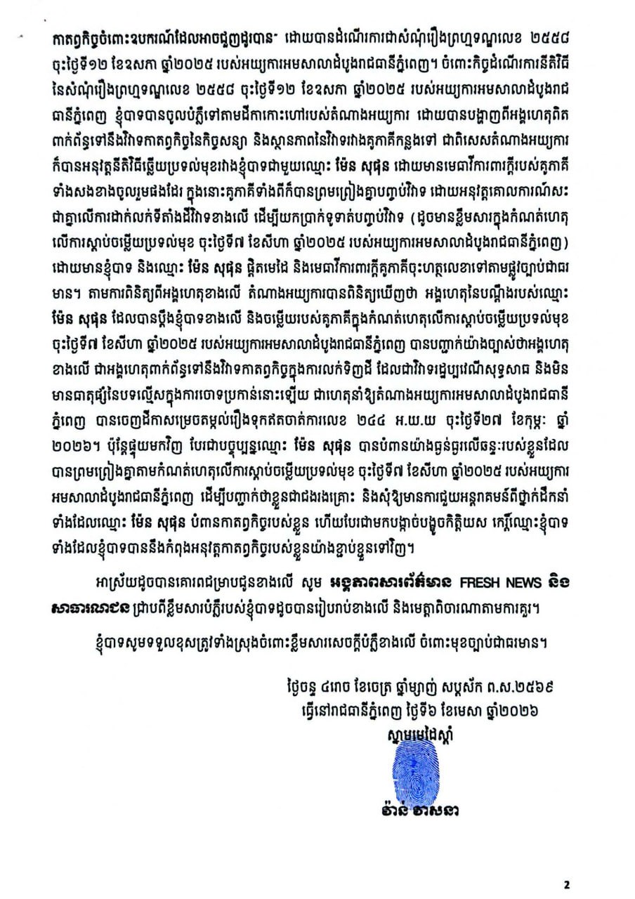 ប៉ុន្តែទោះជាយ៉ាងនេះក្តី លោក ម៉ែន សុផុន នៅតែបន្តការប្តឹងជាបន្តបន្ទាប់ ដែលបច្ចុប្បន្ន ក៏បានប្តឹង លោក វ៉ាន់ វាសនា ទៅកាន់អយ្យការអមសាលាដំបូងរាជធានីភ្នំពេញ និងបានដំណើរការជាសំណុំរឿងព្រហ្មទណ្ឌលេខ ២៥៥៨ ចុះថ្ងៃទី១២ ខែឧសភា ឆ្នាំ២០២៥ របស់អយ្យការអមសាលាដំបូងរាជធានីភ្នំពេញ។