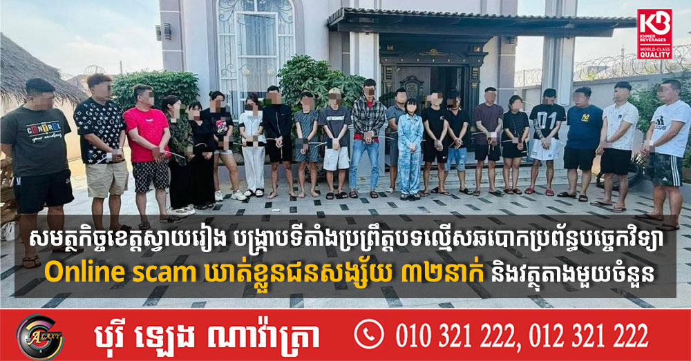 នគរបាលខេត្តស្វាយរៀង បានបញ្ជាក់ថា នៅថ្ងៃទី៦ ខែមេសា ឆ្នាំ២០២៦ លោកវរសេនីយ៍ឯក គឹម ឡៃ ស្នងការរងទទួលផែនការងារនគរបាលព្រហ្មទណ្ឌ បានដឹកនាំកម្លាំងការិយាល័យព្រហ្មទណ្ឌ សហការជាមួយកម្លាំងអធិការដ្ឋាននគរបាលក្រុងបាវិត និងកម្លាំងការិយាល័យប្រឆាំងបទល្មើសបច្ចេកវិទ្យាខេត្ត ដោយមានការសម្របសម្រួលពីកញ្ញា ពៅ ទេវី ព្រះរាជអាជ្ញារង នៃអយ្យការអមសាលាដំបូងខេត្ត បានចុះបង្រ្កាបទីតាំងប្រព្រឹត្តបទល្មើសឆបោកតាមប្រព័ន្ធបច្ចេកវិទ្យា(Online scam) មួយកន្លែងនៅចំណុចផ្ទះវីឡាជួល ស្ថិតក្នុងភូមិបាវិតលើ សង្កាត់បាវិត ក្រុងបាវិត ខេត្តស្វាយរៀង ដោយឃាត់ខ្លួនជនសង្ស័យចំនួន ៣២នាក់ ស្រី ៨នាក់ (ជនជាតិចិន២នាក់ ប្រុស, ជនជាតិវៀតណាម ២៩នាក់ ស្រី ៨នាក់)។