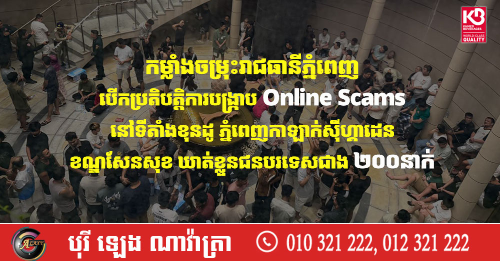 កម្លាំងចម្រុះរាជធានីភ្នំពេញ បើកប្រតិបត្តិការបង្ក្រាប Online Scams នៅទីតាំងខុនដូ ភ្នំពេញកាឡាក់សុីហ្គាដេន ខណ្ឌសែនសុខ ឃាត់ខ្លួនជនបរទេសជាង ២០០នាក់