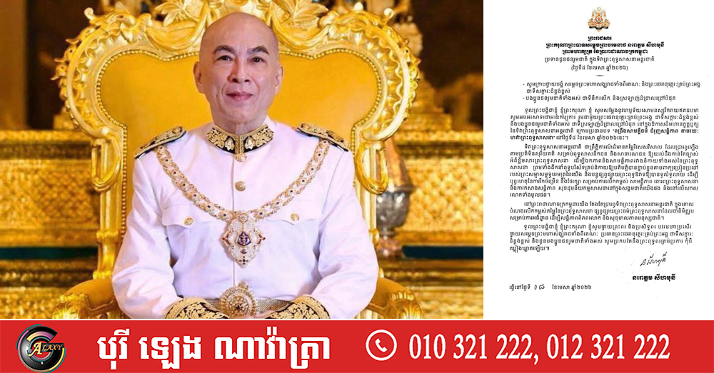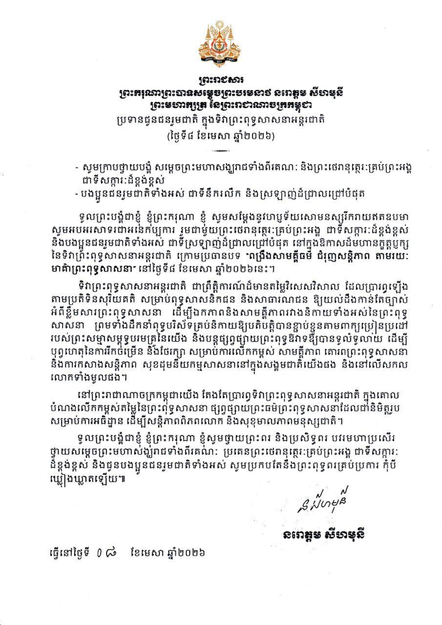 (ភ្នំពេញ)៖ ព្រះករុណា ព្រះបាទសម្តេចព្រះបរមនាថ នរោត្តម សីហមុនី ព្រះមហាក្សត្រនៃព្រះរាជាណាចក្រកម្ពុជា បានប្រទានព្រះរាជសារ ជូនជនរួមជាតិ ក្នុងទិវាព្រះពុទ្ធសាសនាអន្តរជាតិ (ថ្ងៃទី ៨ ខែមេសា ឆ្នាំ ២០២៦)។