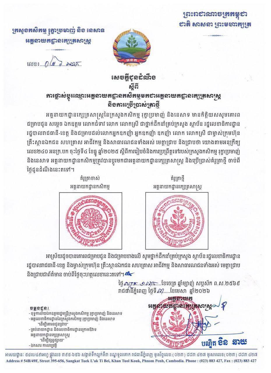 ប្រភពខាងលើ បានឱ្យដឹងដូច្នេះថា អគ្គនាយកដ្ឋានក្សេត្រសាស្ត្រ នៃក្រសួងកសិកម្ម រុក្ខាប្រមាញ់ និងនេសាទ មានកិត្តិយសសូមគោរព ជម្រាបជូន សម្តេច ឯកឧត្តម លោកជំទាវ លោក លោកស្រី ជាថ្នាក់ដឹកនាំគ្រប់ក្រសួង ស្ថាប័ន រដ្ឋលេខាធិការដ្ឋាន រដ្ឋបាលរាជធានី-ខេត្ត និងជម្រាបដល់លោកអ្នកឧកញ៉ា អ្នកឧកញ៉ា ឧកញ៉ា លោក លោកស្រី ជាម្ចាស់ក្រុមហ៊ុន គ្រឹះស្ថានឯកជន សហគ្រាស អាជីវកម្ម និងសាធារណជនទាំងអស់ មេត្តាជ្រាប និងជ្រាបថា យោងតាមអនុក្រឹត្យ លេខ២៤០ អនក្រ.បក ចុះថ្ងៃទី៤ ខែធ្នូ ឆ្នាំ២០២៥ ស្តីពីការរៀបចំនិងការប្រព្រឹត្តទៅរបស់ក្រសួងកសិកម្ម រុក្ខាប្រមាញ់ និងនេសាទ អគ្គនាយកដ្ឋានកសិកម្មត្រូវបានប្តូរមកជាអគ្គនាយកដ្ឋានក្សេត្រសាស្ត្រ និងប្រើប្រាស់គំរូត្រាថ្មី ចាប់ពី ថ្ងៃជូនដំណឹងនេះតទៅ៕