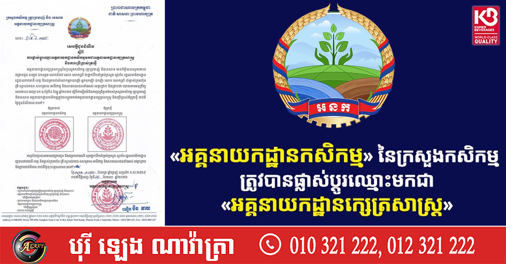 (ភ្នំពេញ)៖ យោងតាមសេចក្តីជូនដំណឹងរបស់អគ្គនាយកដ្ឋានក្សេត្រសាស្ត្រ នៃក្រសួងកសិកម្ម រុក្ខាប្រមាញ់ និងនេសាទ នៅថ្ងៃទី៨ ខែមេសា ឆ្នាំ២០២៦ បានឱ្យដឹងថា «អគ្គនាយកដ្ឋានកសិកម្ម» ត្រូវបានផ្លាស់ប្តូរឈ្មោះមកជា «អគ្គនាយកដ្ឋានក្សេត្រសាស្រ្ត»។