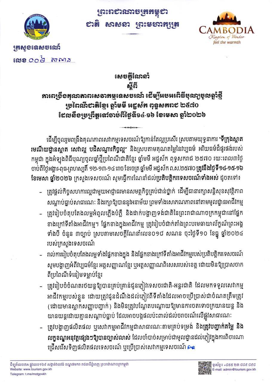 យោងតាមសេចក្ដីណែនាំដែលបណ្ដាញព័ត៌មាន Fresh News ទទួលបានបញ្ជាក់ថា ដើម្បីចូលរួមពង្រឹងគុណភាពសេវាកម្មទេសចរណ៍ឱ្យកាន់តែល្អប្រសើរ ស្របតាមយុទ្ធនាការ «ទីក្រុងស្អាត រមណីយដ្ឋានស្អាត សេវាល្អ បដិសណ្ឋារកិច្ចល្អ» និងស្របតាមគុណតម្លៃនៃវប្បធម៌ អរិយធម៌ដ៏ផូរផង់របស់ កម្ពុជា ក្នុងអំឡុងពិធីបុណ្យចូលឆ្នាំថ្មីប្រពៃណីជាតិខ្មែរ ឆ្នាំមមី អដ្ឋស័ក ពុទ្ធសករាជ ២៥៧០ រយៈពេល៣ថ្ងៃ ចាប់ពីថ្ងៃអង្គារ-ពុធ-ព្រហស្បតិ៍ ១២-១៣-១៤ រោច ខែចេត្រ ឆ្នាំមមី អដ្ឋស័ក ព.ស.២៥៧០ ត្រូវនឹងថ្ងៃទី១៤-១៥-១៦ ខែមេសា ឆ្នាំ២០២៦ ក្រសួងទេសចរណ៍ សូមធ្វើការណែនាំដល់ប្រតិបត្តិករទេសចរណ៍ទាំងអស់ ដូចតទៅ៖