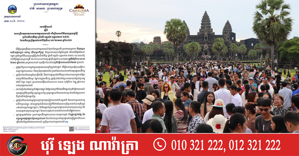 (ភ្នំពេញ)៖ ក្រសួងទេសចរណ៍ នៅថ្ងៃទី៧ ខែមេសា ឆ្នាំ២០២៦ បានចេញសេចក្តីណែនាំស្តីពី «ការពង្រឹងគុណភាពសេវាកម្មទេសចរណ៍ ដើម្បីអបអរពិធីបុណ្យចូលឆ្នាំថ្មីប្រពៃណីជាតិខ្មែរ» ឆ្នាំមមី អដ្ឋស័ក ពុទ្ធសករាជ ២៥៧០ ដែលនឹងប្រព្រឹត្តទៅចាប់ពីថ្ងៃទី១៤-១៦ ខែមេសា ឆ្នាំ២០២៦។