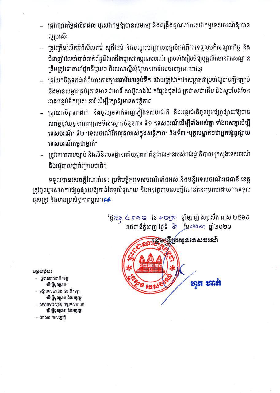 ខាងក្រោមនេះជាខ្លឹមសារទាំងស្រុងនៃសេចក្ដីណែនាំរបស់ក្រសួងទេសចរណ៍៖
