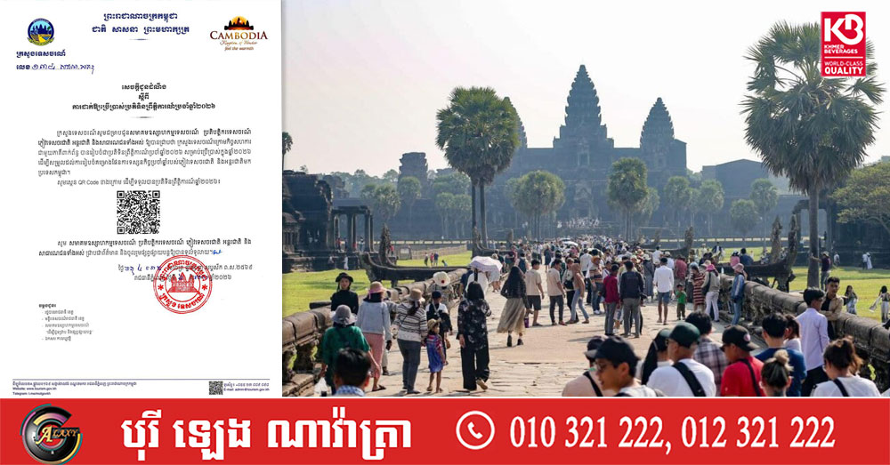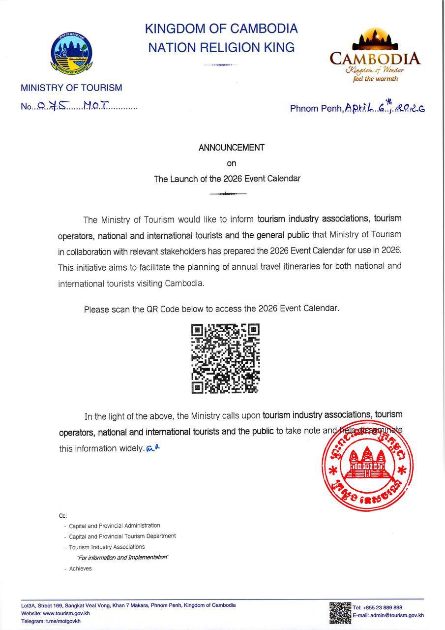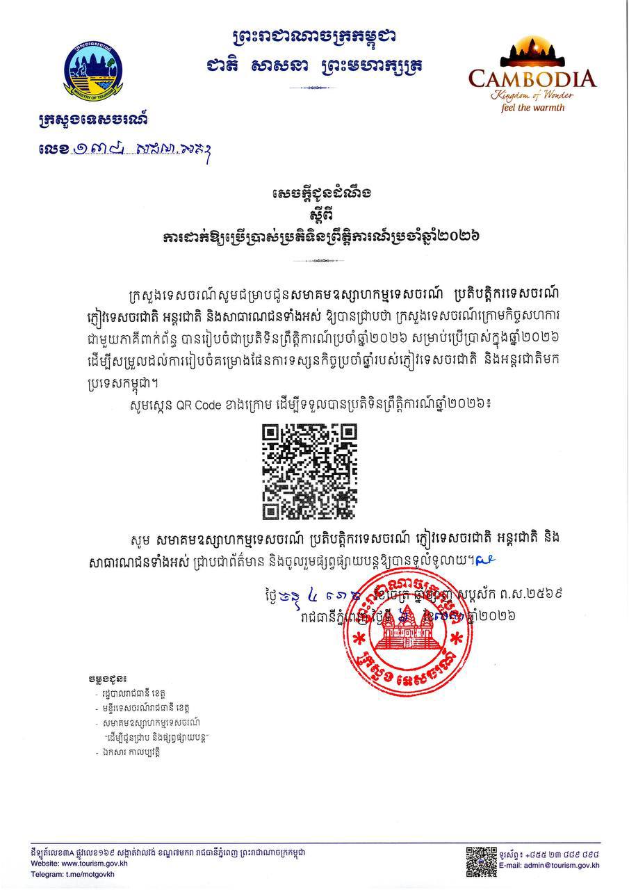 (ភ្នំពេញ)៖ ក្រសួងទេសចរណ៍ នៅថ្ងៃទី៨ ខែមេសា ឆ្នាំ២០២៦ បានចេញសេចក្ដីជូនដំណឹង ដល់សមាគមឧស្សាហកម្មទេសចរណ៍ ប្រតិបត្តិករទេសចរណ៍ ភ្ញៀវទេសចរជាតិ អន្តរជាតិ និងសាធារណជនទាំងអស់ ថា ក្រសួងទេសចរណ៍ក្រោមកិច្ចសហការ ជាមួយភាគីពាក់ព័ន្ធ បានរៀបចំជាប្រតិទិនព្រឹត្តិការណ៍ប្រចាំឆ្នាំ២០២៦ សម្រាប់ប្រើប្រាស់ក្នុងឆ្នាំ២០២៦ ដើម្បីសម្រួលដល់ការរៀបចំគម្រោងផែនការទស្សនកិច្ចប្រចាំឆ្នាំរបស់ភ្ញៀវទេសចរជាតិ និងអន្តរជាតិមក ប្រទេសកម្ពុជា។