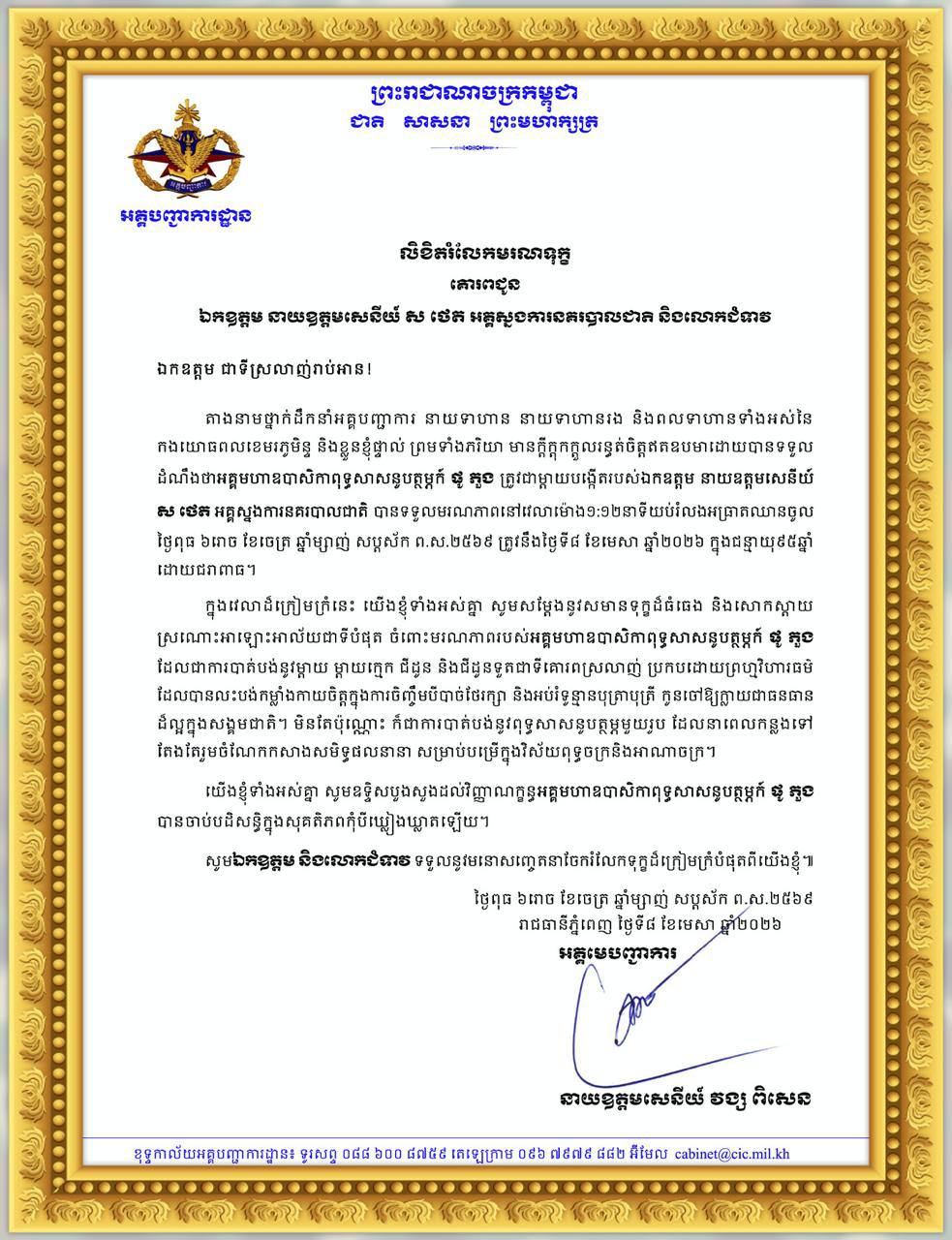 (ភ្នំពេញ)៖ ឯកឧត្ដម នាយឧត្ដមសេនីយ៍ វង្ស ពិសេន អគ្គមេបញ្ជាការ កងយោធពលខេមរភូមិន្ទ ព្រមទាំងថ្នាក់ដឹកនាំ នាយទាហាន នាយទាហានរង និងពលទាហានទាំងអស់នៃកងយោធពលខេមរភូមិន្ទ ផ្ញើសាររំលែកទុក្ខជូន ឯកឧត្ដម នាយឧត្តមសេនីយ៍ ស ថេត អគ្គស្នងការនគរបាលជាតិ ចំពោះមរណភាព