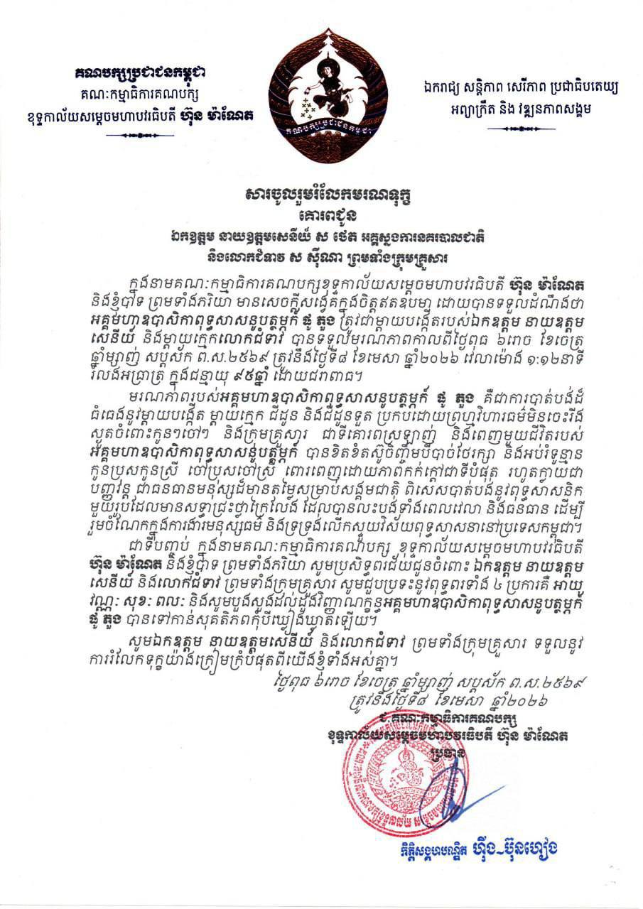 កិត្តិសង្គហបណ្ឌិត ហ៊ីង ប៊ុនហៀង ផ្ញើសាររំលែកទុក្ខជូនឯកឧត្តម នាយឧត្តមសេយ៍ ស ថេត ចំពោះមរណភាពអគ្គមហាឧបាសិកាពុទ្ធសាសនូបត្ថម្ភក៍ ផូ ភួង ដែលត្រូវជាម្តាយបង្កើត