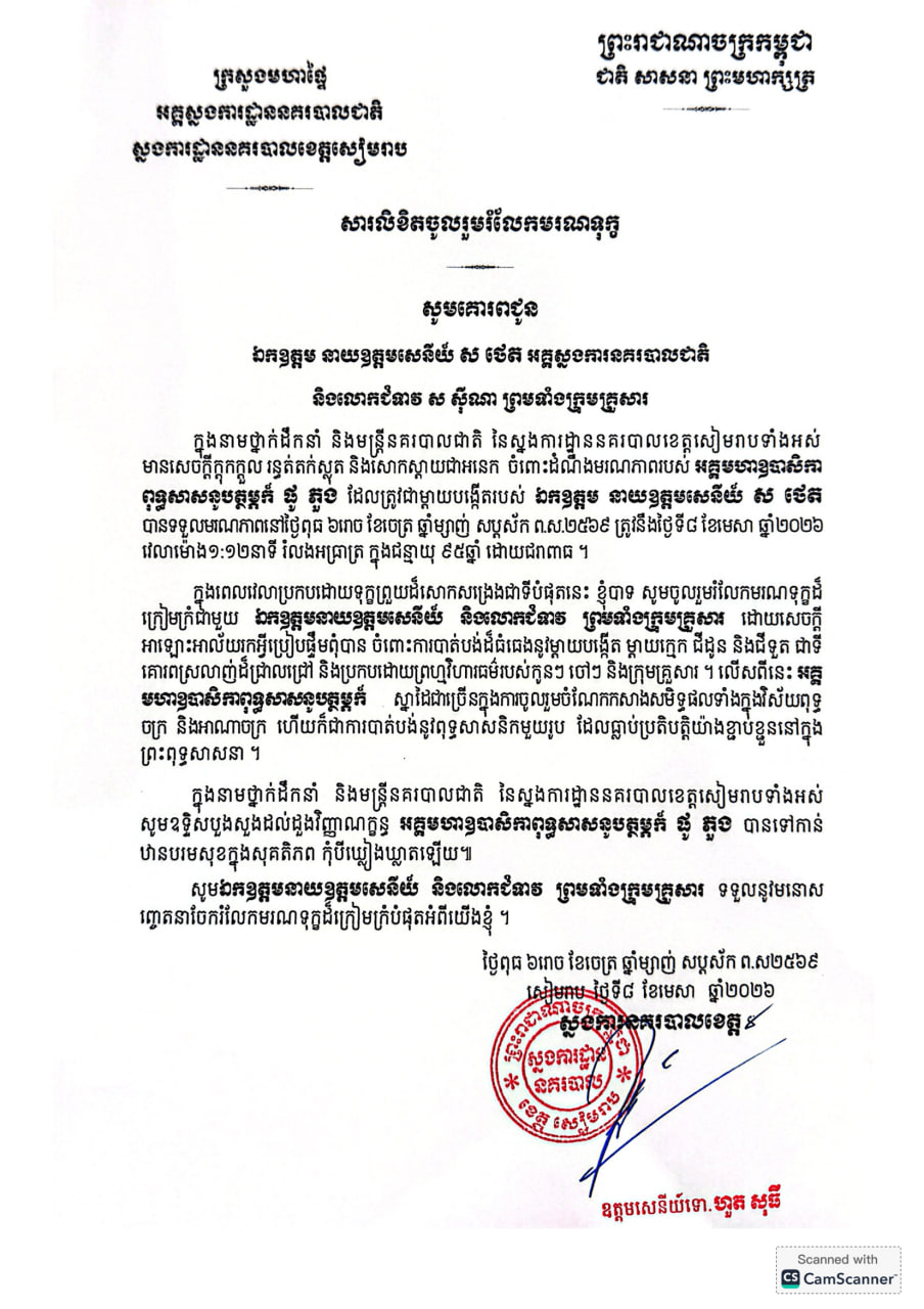 (ភ្នំពេញ)៖ ឧត្តមសេនីយ៍ទោ ហួត សុធី ស្នងការនគរបាលខេត្តសៀមរាប ព្រមទាំងមន្រ្តីនគរបាលក្រោមឱវាទទាំងអស់ បានផ្ញើសាររំលែកមរណទុក្ខជូនឯកឧត្តម នាយឧត្តមសេនីយ៍ ស ថេត អគ្គស្នងការនគរបាលជាតិ និងលោកជំទាវ ព្រមទាំងក្រុមគ្រួសារ ចំពោះមរណភាពរបស់អគ្គមហាឧបាសិកាពុទ្ធសាសនូបត្ថម្ភក៍ ផូ ភួង ត្រូវជាម្តាយបង្កើតរបស់នាយឧត្តមសេនីយ៍ ដែលបានទទួលមរណភាពកាលពីថ្ងៃពុធ ៦រោច ខែចេត្រ ឆ្នាំម្សាញ់ សប្តស័ក ព.ស.២៥៦៩ ត្រូវនឹងថ្ងៃទី៨ ខែមេសា ឆ្នាំ២០២៦ វេលាម៉ោង ១:១២នាទីរំលងអាធ្រាត្រ ក្នុងជន្មាយុ ៩៥ឆ្នាំ ដោយជរាពាធ។