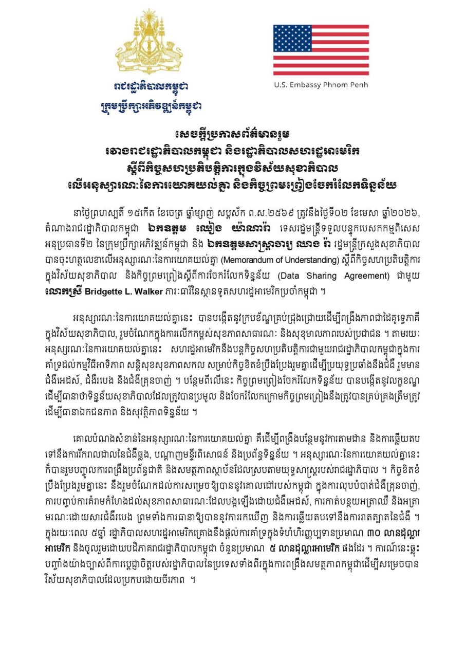 (ភ្នំពេញ)៖ តំណាងរាជរដ្ឋាភិបាលកម្ពុជា លោក ឈៀង យ៉ាណារ៉ា ទេសរដ្ឋមន្ត្រីទទួលបន្ទុកបេសកកម្មពិសេស អនុប្រធានទី២ នៃក្រុមប្រឹក្សាអភិវឌ្ឍន៍កម្ពុជា និងលោកសាស្ត្រាចារ្យ ឈាង រ៉ា រដ្ឋមន្ត្រីក្រសួងសុខាភិបាល នៅថ្ងៃទី២ ខែមេសា ឆ្នាំ២០២៦ បានចុះហត្ថលេខាលើអនុស្សារណៈនៃការយោគយល់គ្នា (Memorandum of Understanding) ស្តីពីកិច្ចសហប្រតិបត្តិការក្នុងវិស័យសុខាភិបាល និងកិច្ចព្រមព្រៀង ស្តីពីការចែករំលែកទិន្នន័យ (Data Sharing Agreement) ជាមួយ លោកស្រី Bridgette L. Walker ភារៈធារីនៃស្ថានទូតសហរដ្ឋអាមេរិកប្រចាំកម្ពុជា។