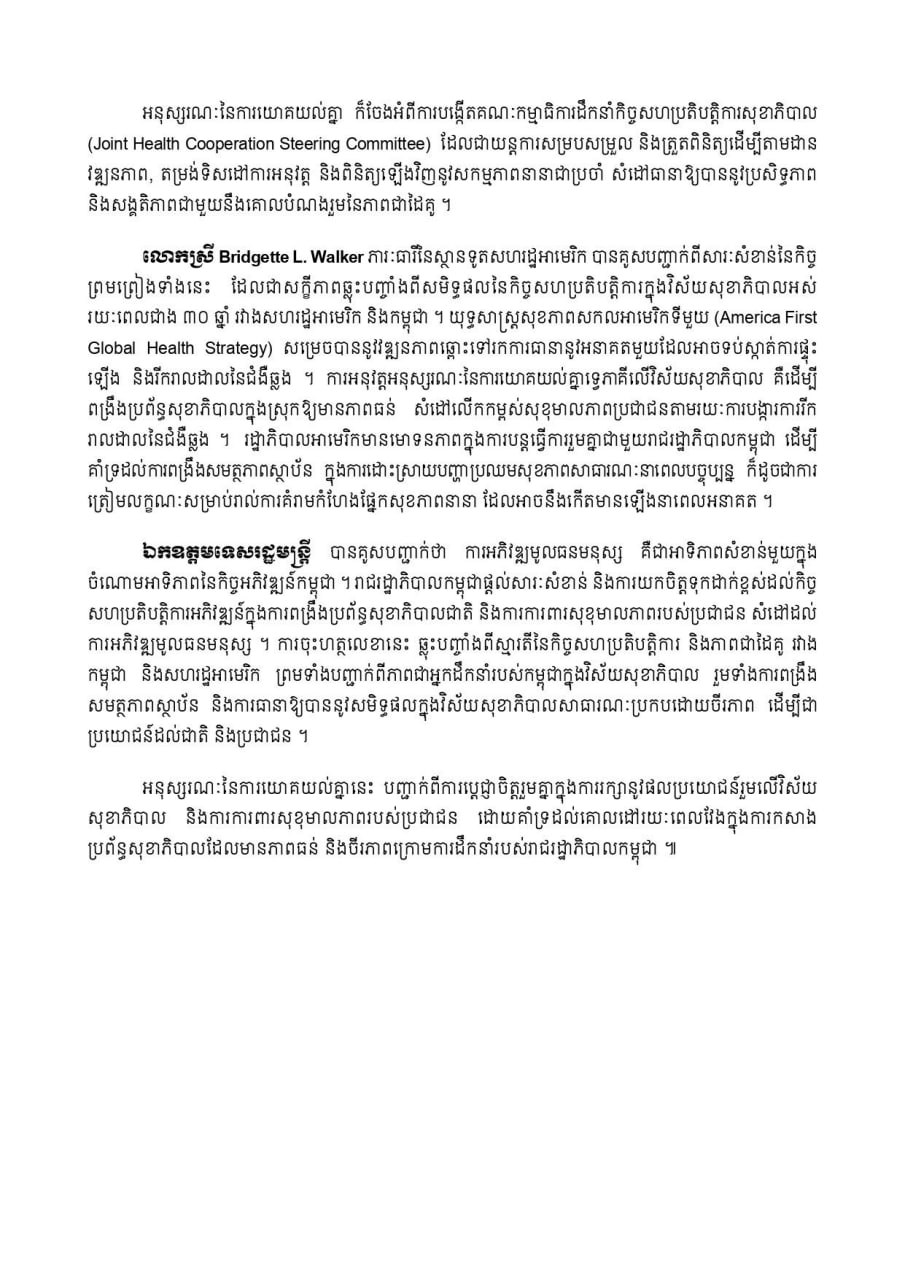 លោកស្រី Bridgette L. Walker ភារៈធារីនៃស្ថានទូតសហរដ្ឋអាមេរិក បានគូសបញ្ជាក់ពីសារៈសំខាន់នៃកិច្ចព្រមព្រៀងទាំងនេះ ដែលជាសក្ខីភាពឆ្លុះបញ្ចាំងពីសមិទ្ធផលនៃកិច្ចសហប្រតិបត្តិការក្នុងវិស័យសុខាភិបាលអស់ រយៈពេលជាង ៣០ឆ្នាំ រវាងសហរដ្ឋអាមេរិក និងកម្ពុជា។ យុទ្ធសាស្ត្រសុខភាពសកលអាមេរិកទីមួយ (America First Global Health Strategy) សម្រេចបាននូវវឌ្ឍនភាពឆ្ពោះទៅរកការធានានូវអនាគតមួយដែលអាចទប់ស្កាត់ការផ្ទុះឡើង និងរីករាលដាលនៃជំងឺឆ្លង។