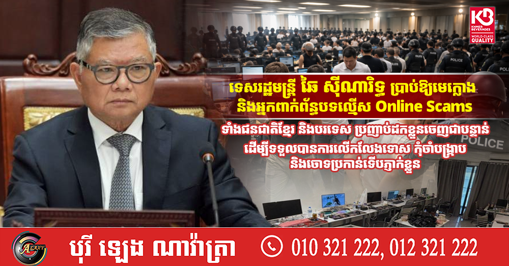 ទេសរដ្ឋមន្ត្រី ឆៃ ស៊ីណារិទ្ធ ប្រាប់ឱ្យមេក្លោង និងអ្នកពាក់ព័ន្ធបទល្មើស Online Scams ទាំងជនជាតិខ្មែរ និងបរទេស ប្រញាប់ដកខ្លួនចេញជាបន្ទាន់ ដើម្បីទទួលបានការលើកលែងទោស កុំចាំបង្ក្រាប និងចោទប្រកាន់ទើបភ្ញាក់ខ្លួន