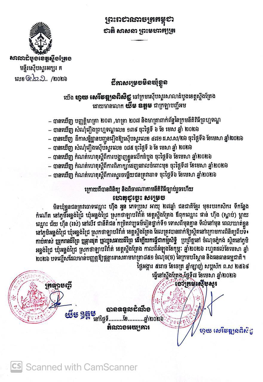នៅថ្ងៃទី៦ ខែមេសា ឆ្នាំ ២០២៦ មន្ទីរបរិស្ថានខេត្តស្ទឹងត្រែង បានកសាងសំណុំរឿងបញ្ជូនមកសាលាដំបូងខេត្តស្ទឹងត្រែង ដោយចោទប្រកាន់ឈ្មោះ ហ៊ីង អូន រស់នៅភូមិ ឃុំអន្លង់ជ្រៃ ស្រុកថាឡាបរិវ៉ាត់ ខេត្តស្ទឹងត្រែង ពីបទកាប់គាស់ ឬរុករានដីព្រៃ ឬឆ្ការដុត ឬឈូសឆាយដីព្រែ ដើម្បីយកធ្វើជាកម្មសិទ្ធិ។