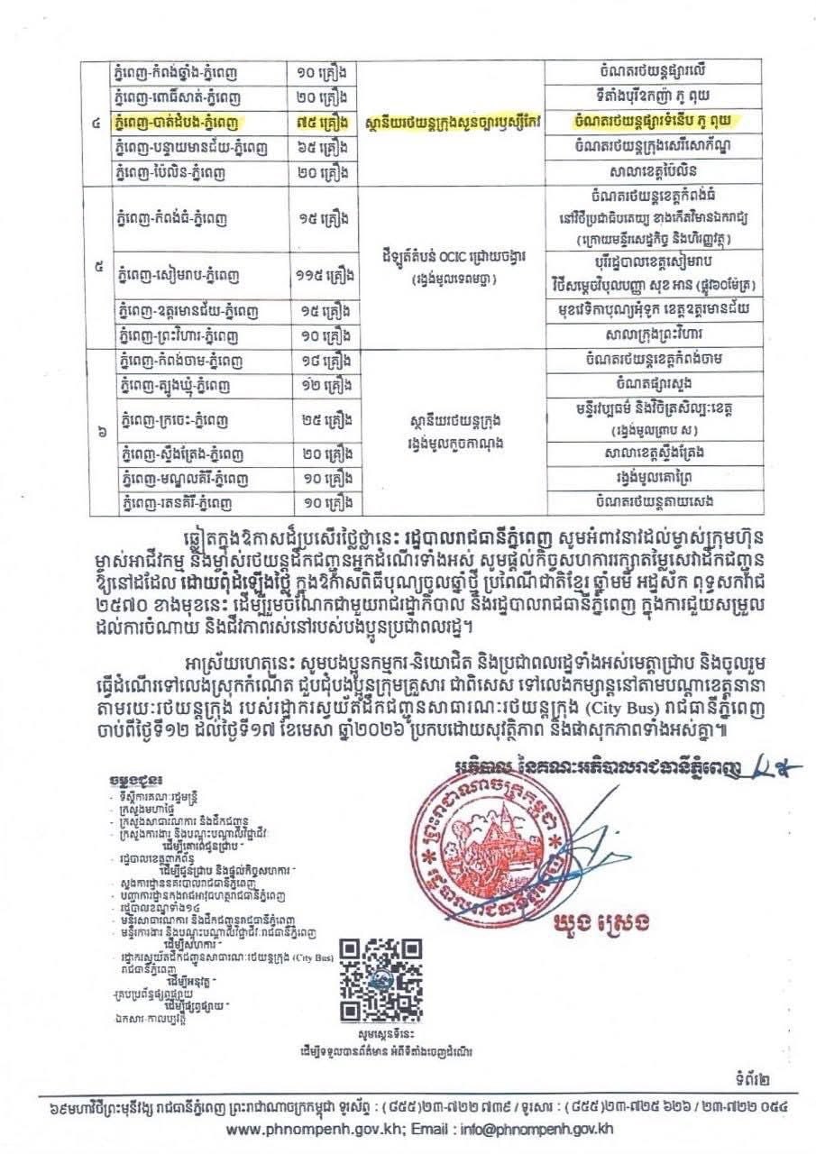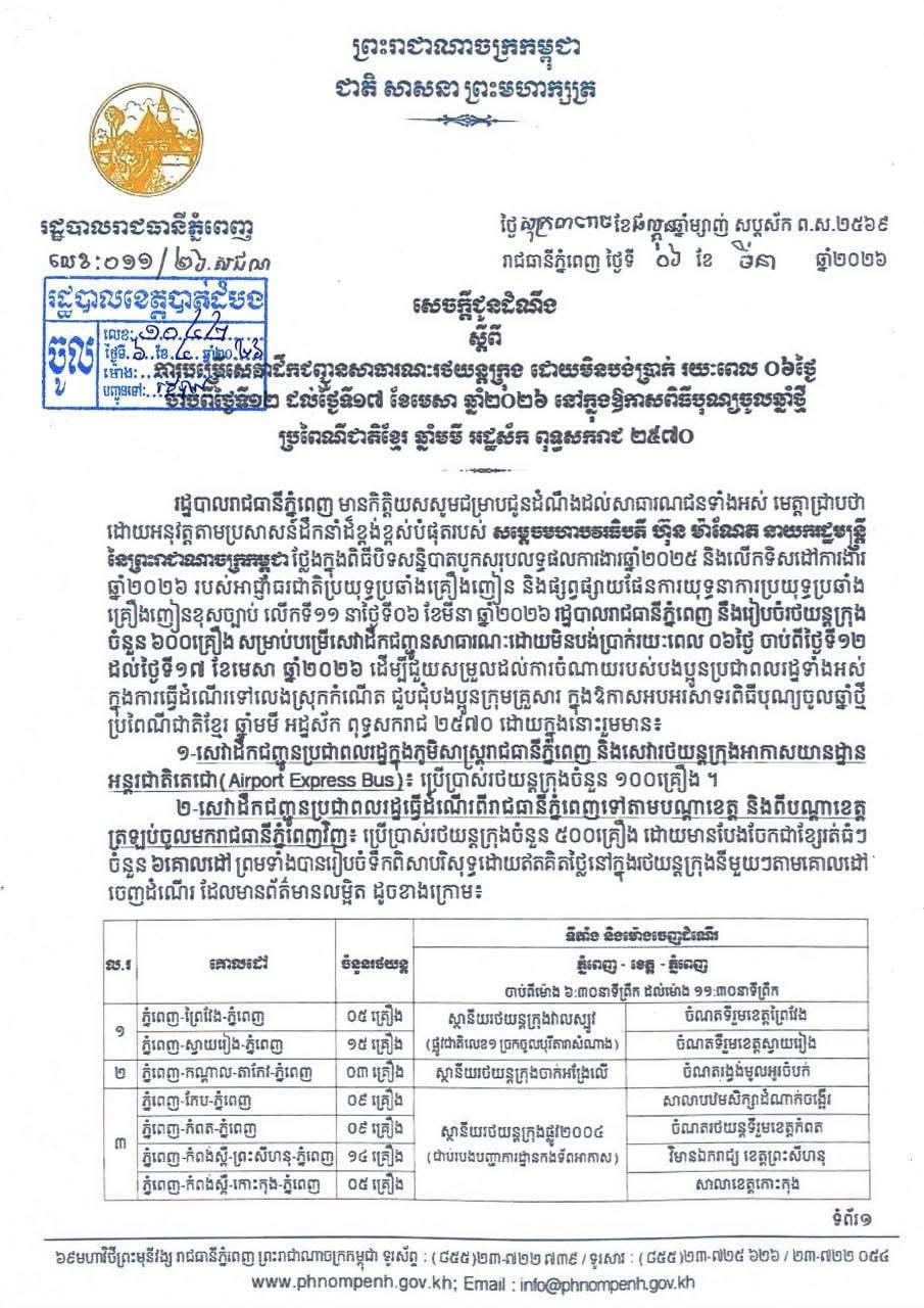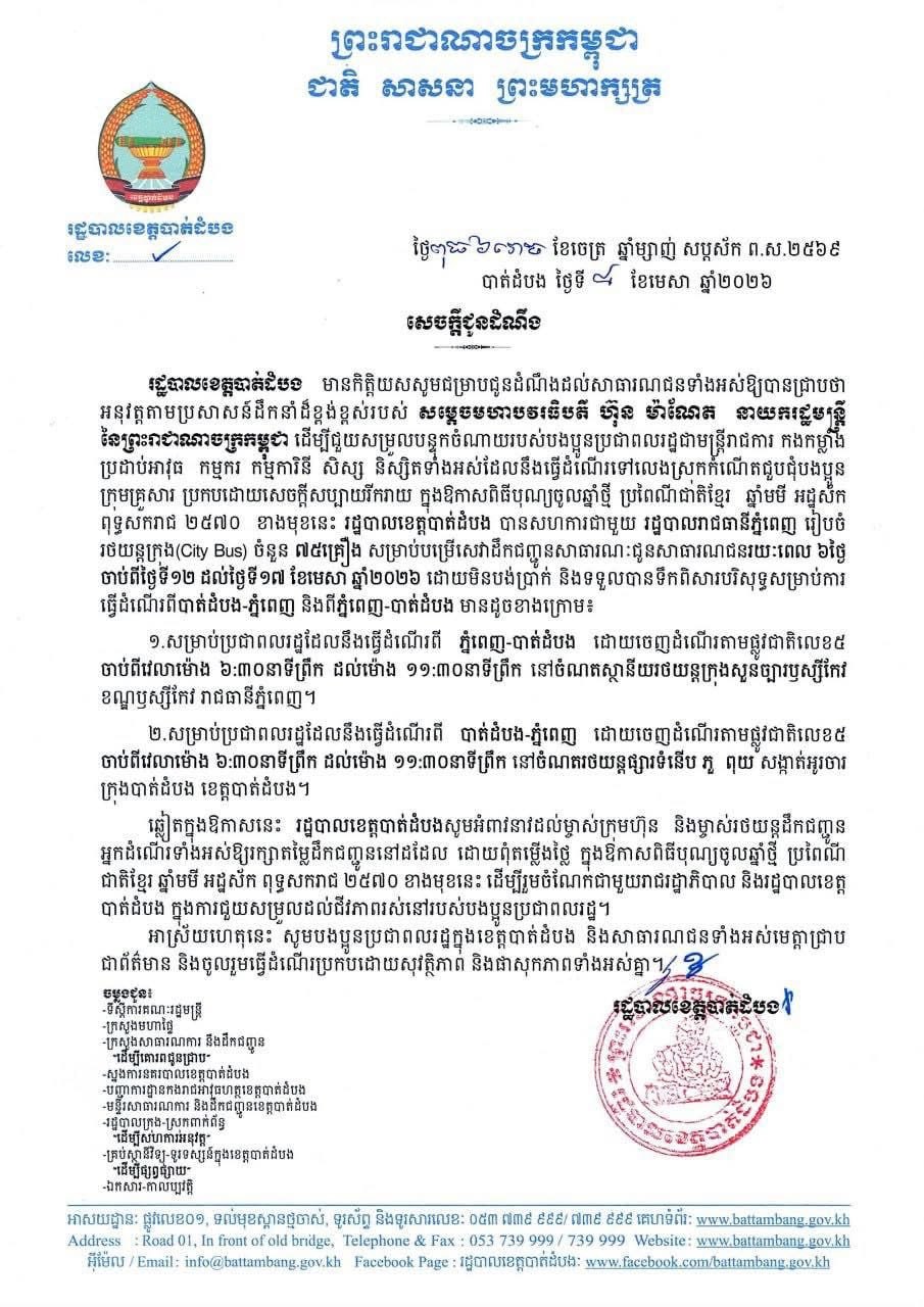 អនុវត្តតាមប្រសាសន៍ដឹកនាំដ៏ខ្ពង់ខ្ពស់របស់ សម្តេចមហាបវរធិបតី ហ៊ុន ម៉ាណែត នាយករដ្ឋមន្ត្រី នៃព្រះរាជាណាចក្រកម្ពុជា ដើម្បីជួយសម្រួលបន្ទុកចំណាយរបស់បងប្អូនប្រជាពលរដ្ឋជាមន្ត្រីរាជការ កងកម្លាំង ប្រដាប់អាវុធ កម្មករ កម្មការិនី សិស្ស និស្សិតទាំងអស់ដែលនឹងធ្វើដំណើរទៅលេងស្រុកកំណើតជួបជុំបងប្អូន ក្រុមគ្រួសារ ប្រកបដោយសេចក្តីសប្បាយរីករាយ ក្នុងឱកាសពិធីបុណ្យចូលឆ្នាំថ្មី ប្រពៃណីជាតិខ្មែរ ឆ្នាំមមី អដ្ឋស័ក ពុទ្ធសករាជ ២៥៧០ ខាងមុខនេះ រដ្ឋបាលខេត្តបាត់ដំបង បានសហការជាមួយ រដ្ឋបាលរាជធានីភ្នំពេញ រៀបចំរថយន្តក្រុង(City Bus) ចំនួន ៧៥គ្រឿង សម្រាប់បម្រើសេវាដឹកជញ្ជូនសាធារណៈជូនសាធារណជនរយៈពេល ៦ថ្ងៃ ចាប់ពីថ្ងៃទី១២ ដល់ថ្ងៃទី១៧ ខែមេសា ឆ្នាំ២០២៦ ដោយមិនបង់ប្រាក់ និងទទួលបានទឹកពិសារបរិសុទ្ធសម្រាប់ការ ធ្វើដំណើរពីបាត់ដំបង-ភ្នំពេញ និងពីភ្នំពេញ-បាត់ដំបង មានដូចខាងក្រោម៖