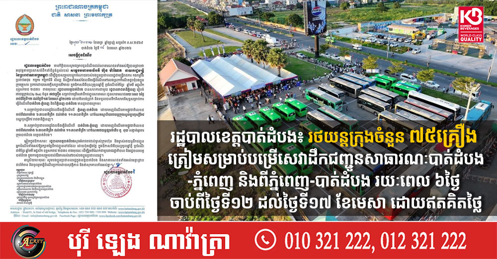 រដ្ឋបាលខេត្តបាត់ដំបង៖ រថយន្តក្រុងចំនួន ៧៥គ្រឿង ត្រៀមសម្រាប់បម្រើសេវាដឹកជញ្ជូនសាធារណៈបាត់ដំបង-ភ្នំពេញ និងពីភ្នំពេញ-បាត់ដំបង រយៈពេល ៦ថ្ងៃ ចាប់ពីថ្ងៃទី១២ ដល់ថ្ងៃទី១៧ ខែមេសា ដោយឥតគិតថ្លៃ