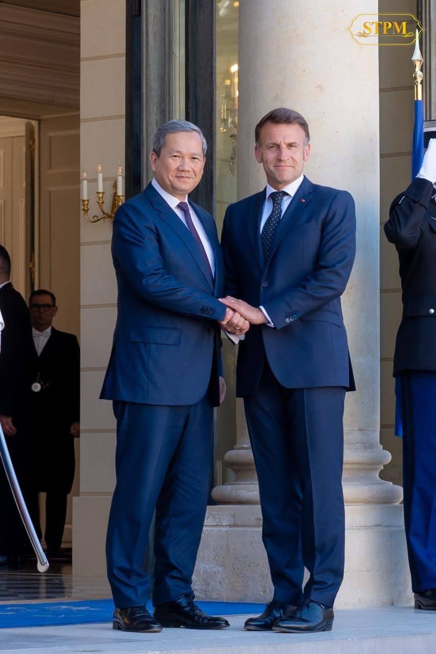 (ភ្នំពេញ)៖ សម្តេចធិបតី ហ៊ុន ម៉ាណែត នាយករដ្ឋមន្រ្តីនៃកម្ពុជា សូមអរគុណលោកប្រធានាធិបតីបារាំង Emmanuel Macron ចំពោះការស្វាគមន៍យ៉ាងកក់ក្តៅ និងកិច្ចពិភាក្សាការងារប្រកបដោយលទ្ធផលវិជ្ជមាន ដើម្បីពង្រឹងចំណង មិត្តភាពទ្វេភាគីរវាងប្រទេសយើងទាំងពីរ ជាពិសេសការរៀបចំតម្លើងកម្រិត នៃទំនាក់ទំនងរវាងកម្ពុជានិងបារាំងដល់កម្រិត «ភាពជាដៃគូរយុទ្ធសាស្ត្រ - Strategic Partnership» នៅពេលឆាប់ៗខាងមុខ។