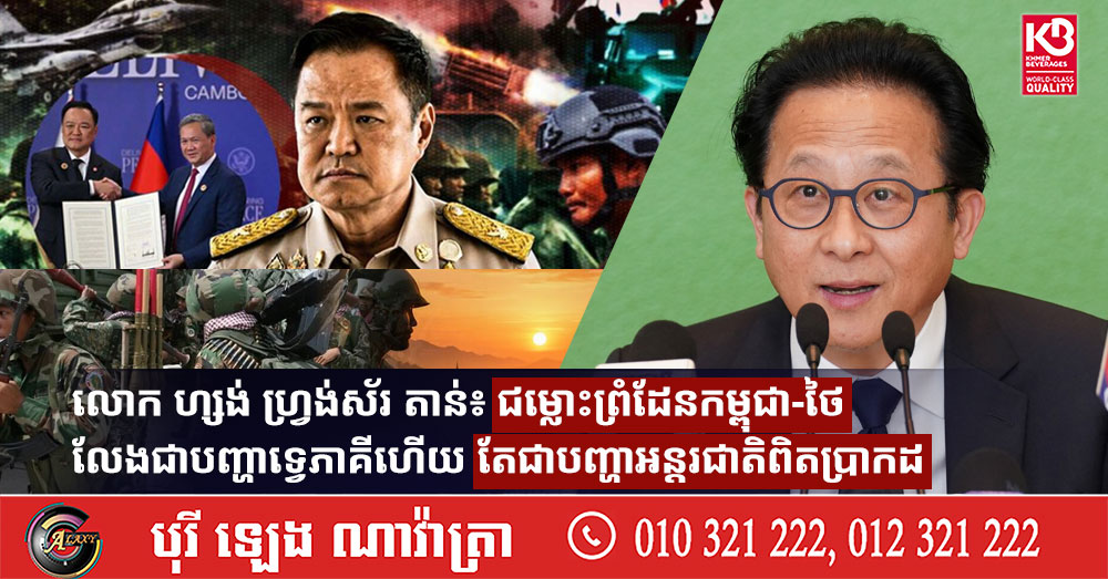 (ភ្នំពេញ)៖ លោក ហ្សង់ ហ្វ្រង់ស្វ័រ តាន់ រដ្ឋមន្រ្តីប្រតិភូអមនាយករដ្ឋមន្រ្តី បានថ្លែងបញ្ជាក់ថា ជម្លោះព្រំដែនកម្ពុជា-ថៃ លែងជាបញ្ហាទ្វេភាគីហើយ តែជាបញ្ហាអន្តរជាតិយ៉ាងពិតប្រាកដ ដោយសារបញ្ហានេះមានការជួយសម្របសម្រួលរបស់អាស៊ាន ការជួយសម្របសម្រួលពីអាមេរិក និងការជួយសម្របសម្រួលពីចិនផងដែរ។